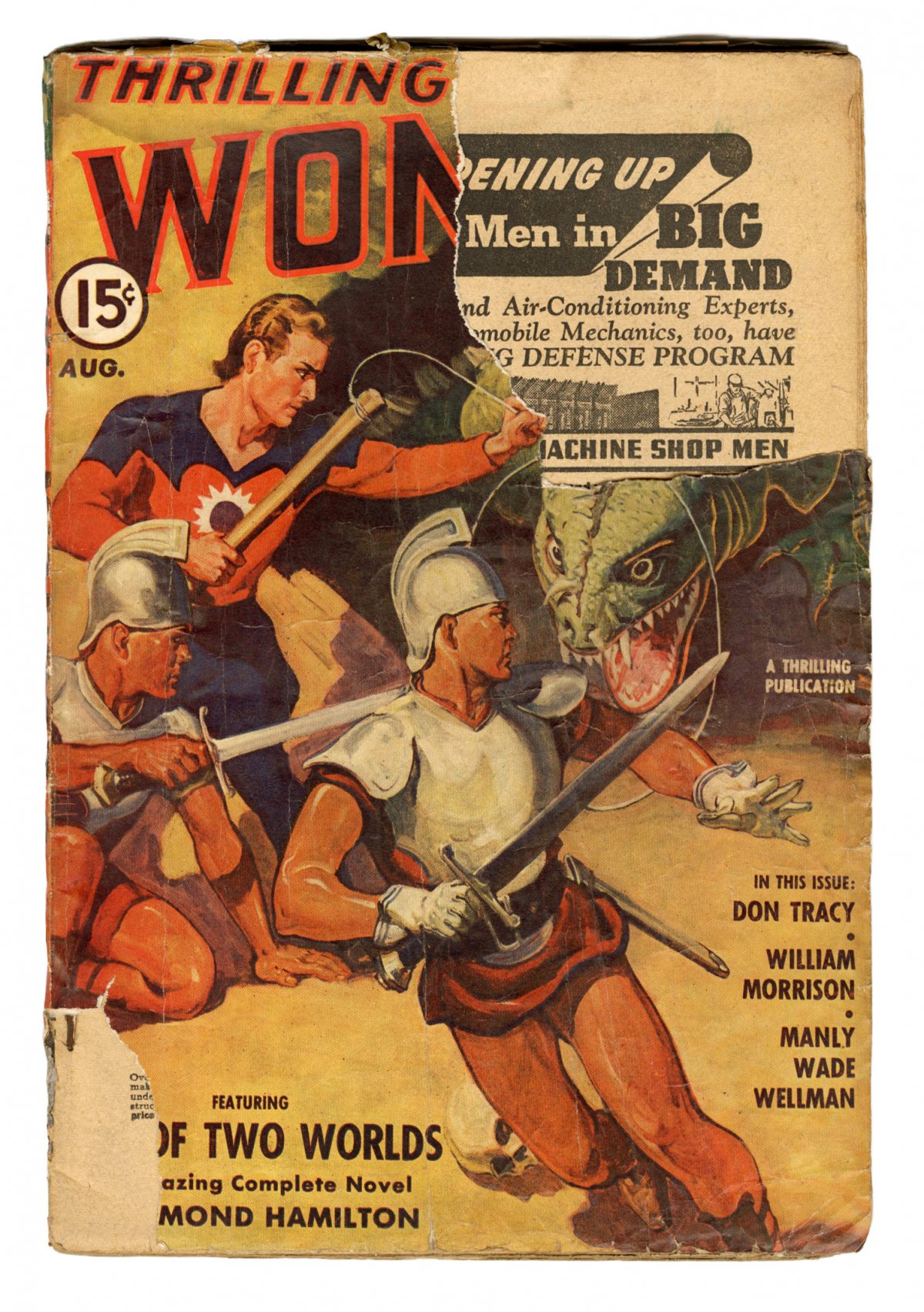 August 1941; monster cover by Rudolph Belarski; stories by Edmond Hamilton, Manly Wade Wellman, John Broome, Virgil Finlay interior illustrations"Son of Two Worlds" story by Edmond Hamilton (Golden Age DC comics writer); "Space Chore" story by Manly Wade Wellman (ghostwriter on Will Eisner's The Spirit); "Masters of Chance" story by William Morrison; "Appointment in Space" story by John Broome (creator of the Silver Age Flash (Barry Allen) and Green Lantern (Hal Jordan) at DC); "In the Ancient Way" story by Harry Walton; "Time-Table for Earth" story by C.P. Mason; "Pettigrew Lives Again" story by Don Tracy