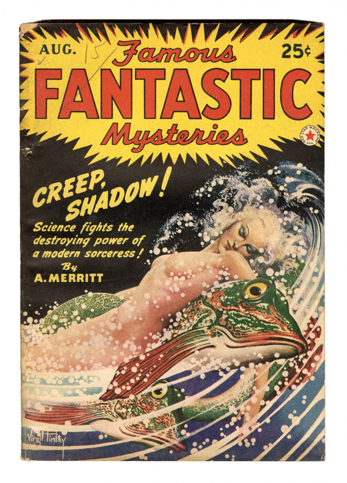 August, 1942; classic Finlay nude cover; "Creep, Shadow!" by Abraham Merritt, "A Roman Resurrection" by Lee Meriwether, and "The Outcast" by E. F. Benson; Interior artwork by Virgil Finlay and Frank R. Paul