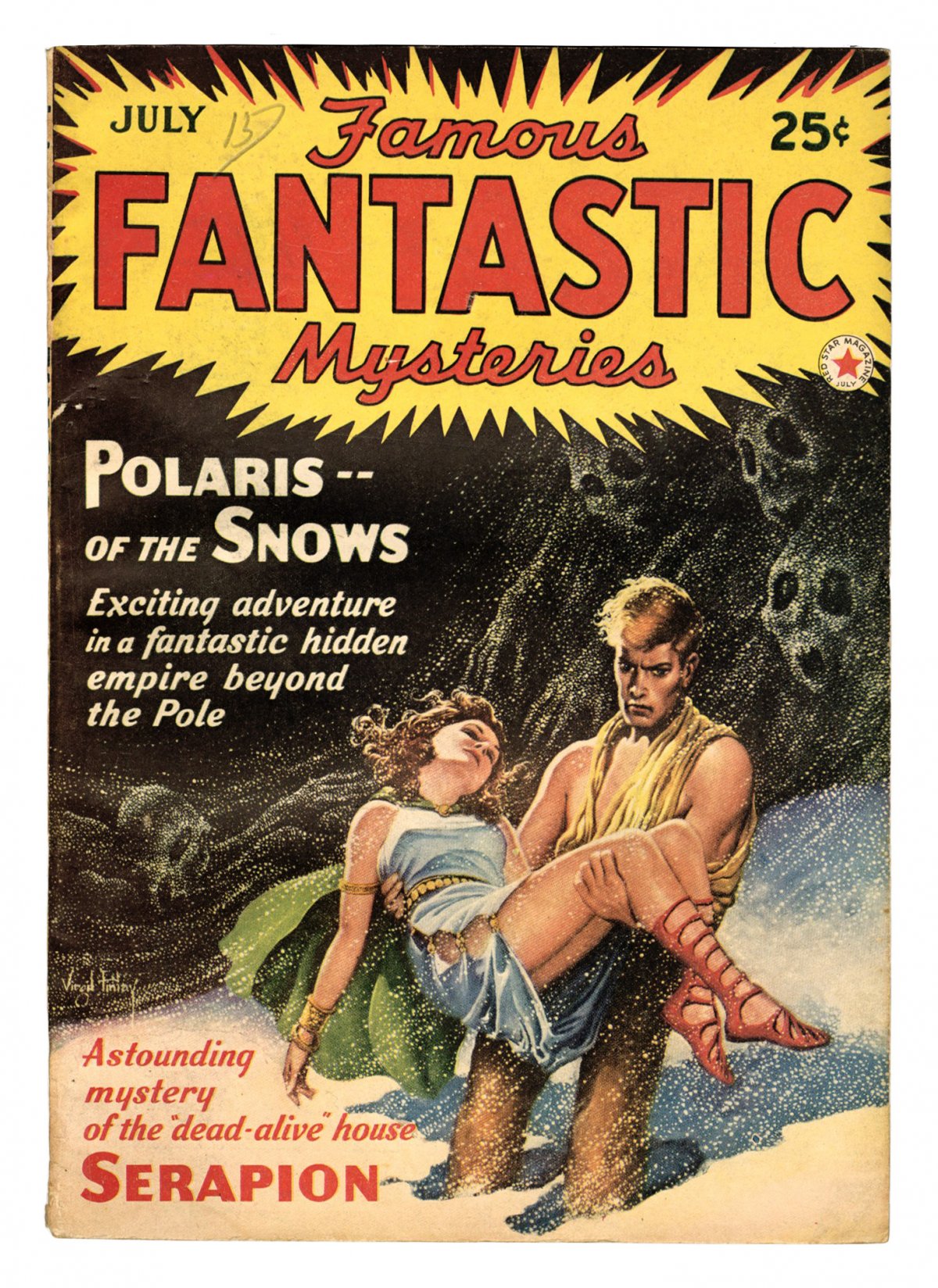 July 1942 (V4 #3). cover by Virgil Finlay. Fantasy stories "Polaris - of the Snows" by Charles B. Stilson and "Serapion" by Francis Stevens. Interior artwork by Virgil Finlay and Frank R. Paul.