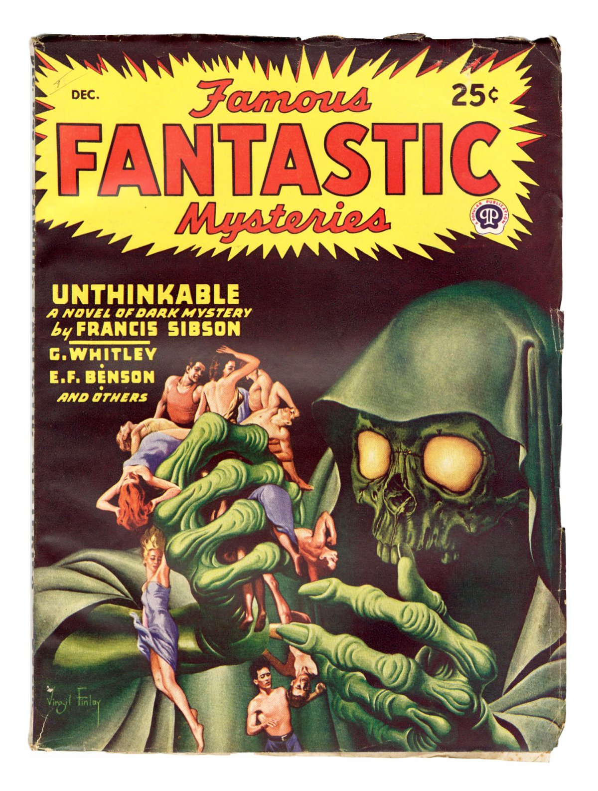 December 1946; classic Finlay cover - giant hooded green skeleton grabs fistful of people