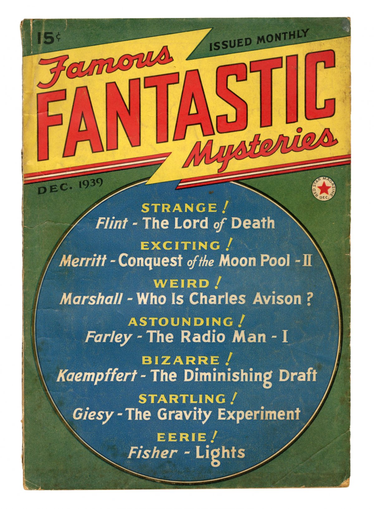 Dec 1939. Text Cover. Sci-Fi/Fantasy stories by A. Merritt ("Conquest of the Moon Pool" - part 2 of 6"), Ralphe Milne Farley, Waldemar Kaempffert, Homer Eon Flint, Philip Fisher, and Edison Tesla Marshall. Illustrations by Virgil Finlay and Frank R. Paul.