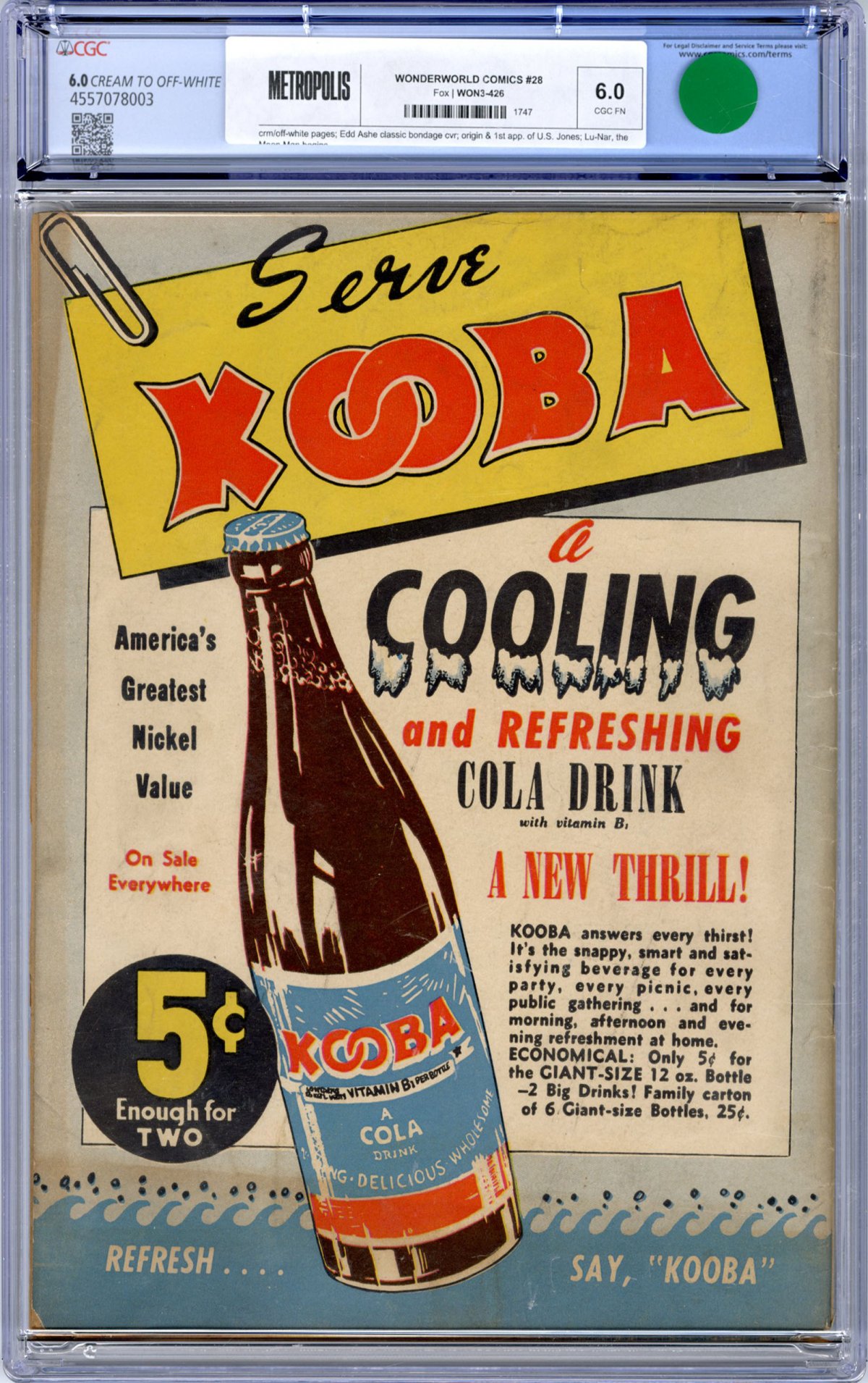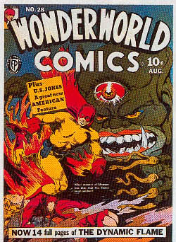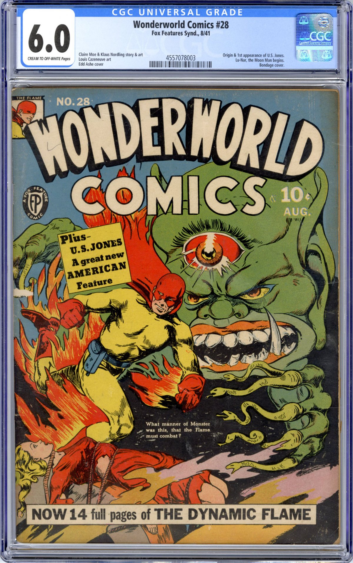The cover of Wonderworld Comics #28 features the Flame, one of Fox Feature Syndicates' most-popular heroes of the Golden Era. The Flame has a fairly odd origin story for his time as the character was raised by mystical lamas that rescued him and trained him to manipulate fire, control his body temperature, and travel by materializing inside of a blaze. Along with the Blue Beetle, and Samson, Flame led the Fox stable until the imprint's demise in 1942. A 7.0 sold for $20,400 in 2024.