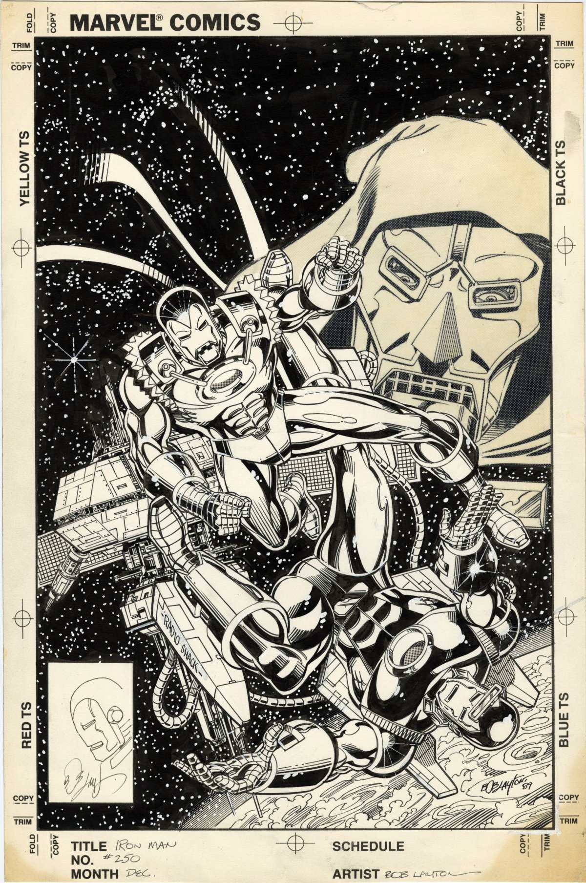 Bob Layton pencils and inks; Unpublished cover; 1989; image size 10" x 15"Great cover, featuring Iron Man battling his alternate reality heir Andros Stark, with the looming visage of Dr. Doom hovering over them both. Pen and ink. Art is in excellent condition. This cover went unused in favor of the, IMHO, inferior published version which featured a more traditional image of Iron Man, Dr. Doom, and Merlin. Signed by Layton in the image as well as in the UPC box.
