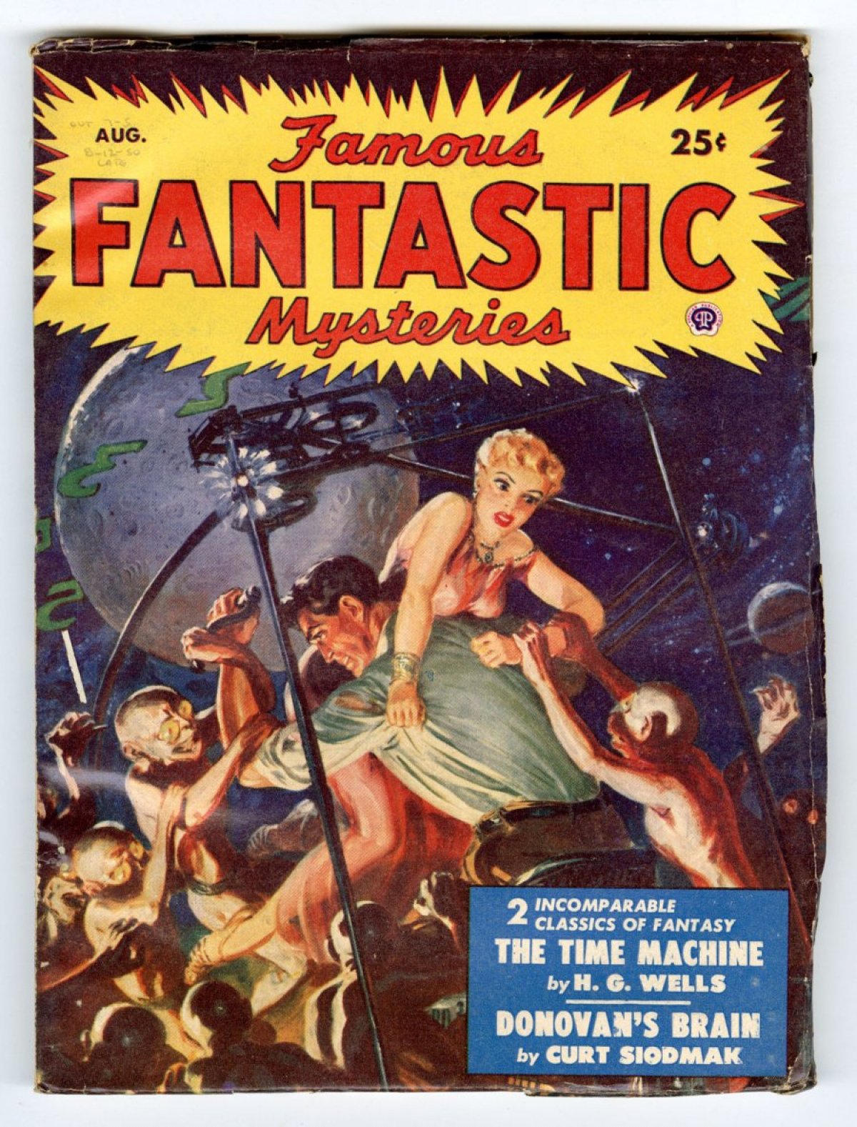 August, 1950; man rescues girl from aliens cover by Saunders; 'The Time Machine' reprint story by H.G. Wells, and other short stories; letter from Robert Silverberg