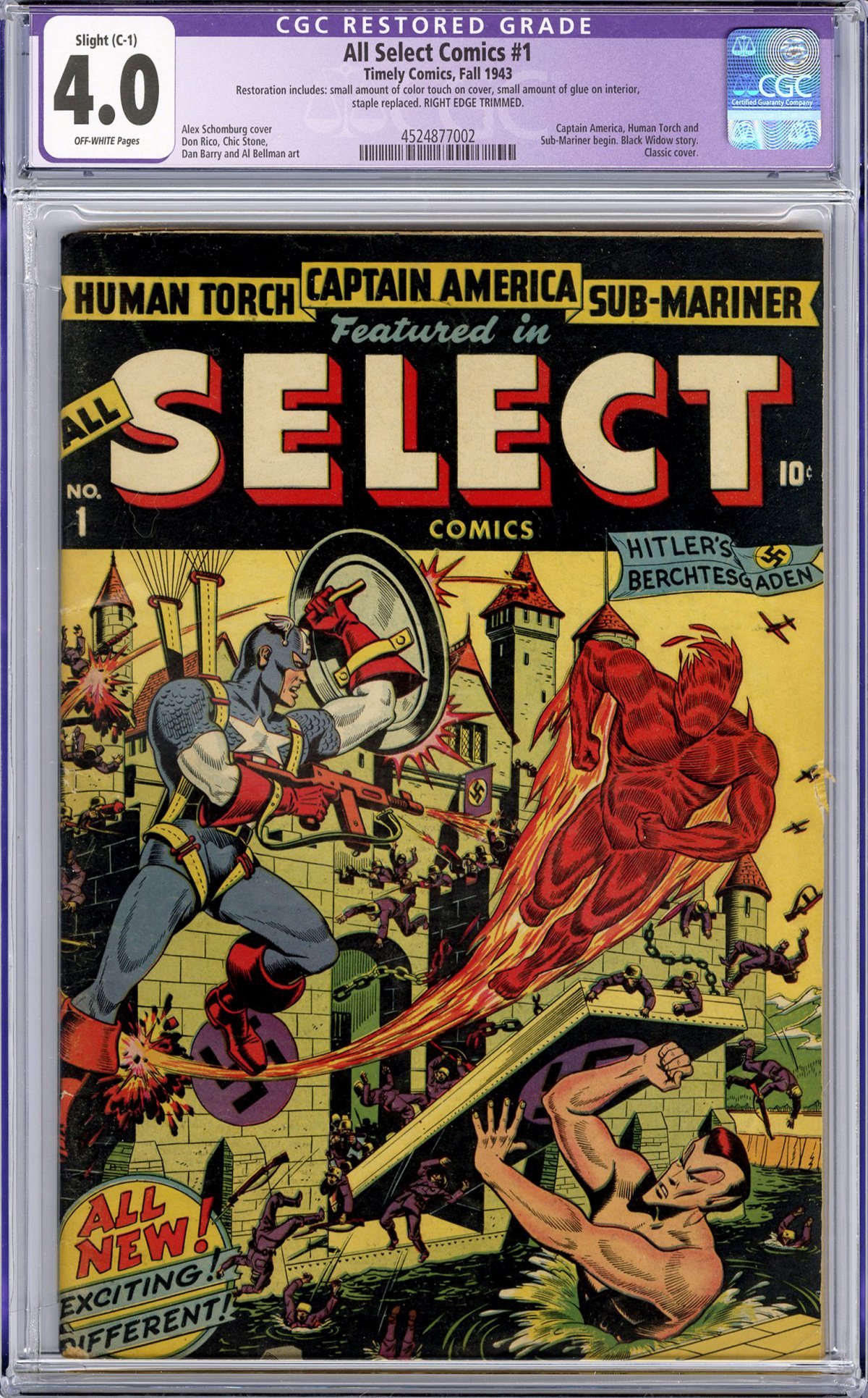 All Select Comics #1 came out in 1943 as the inevitable all-star title after Timely Publishing had crammed their heroes into every comic they possibly could. Of course, legendary Golden Age artist Alex Schomburg was also brought in to work Timely's top heroes into another battle-crazed WWII cover. The book was an instant success with