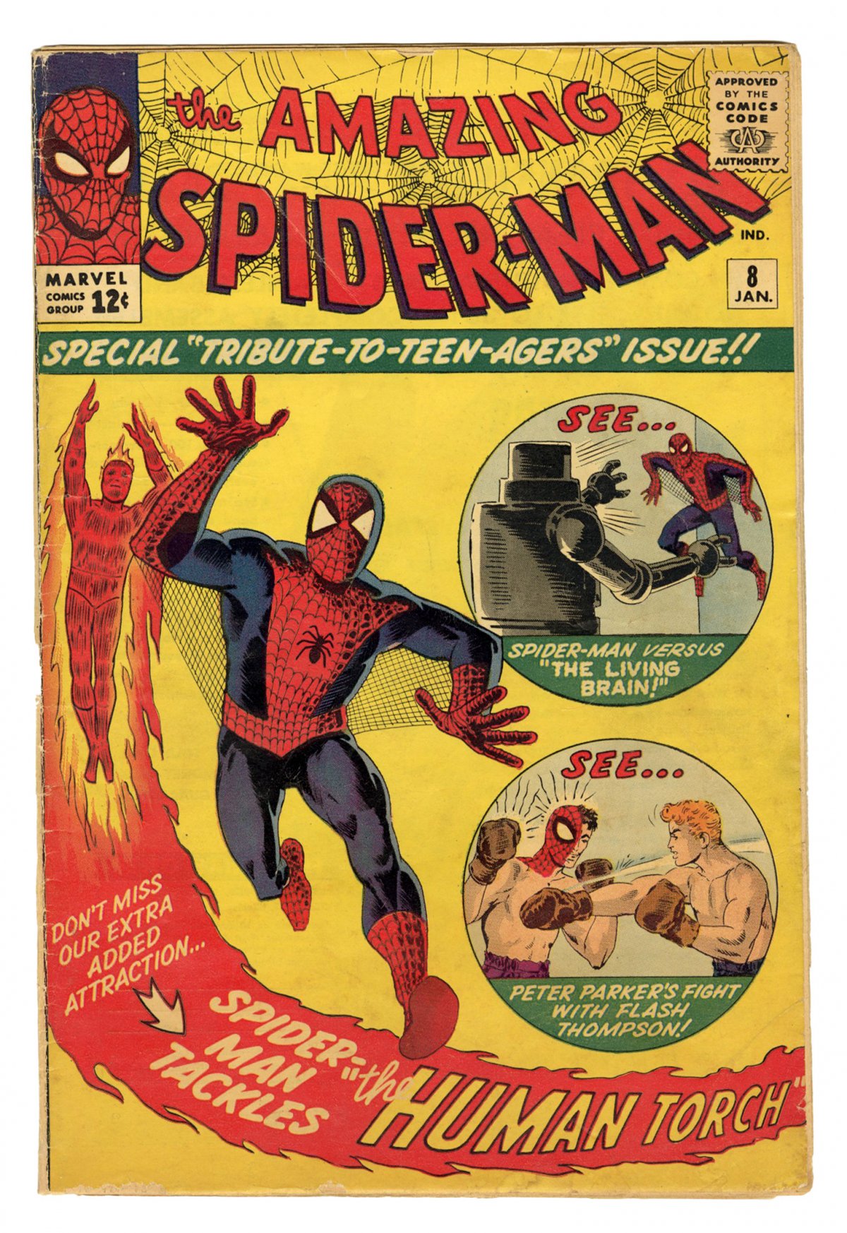 In the debut issue of Spider-Man, Lee and company hedged their bets by placing the Fantastic Four front and center to attract new readers to an unproven title. What a difference a year makes, when the new megastar on the block relegates the veteran Torch to guest-star status. The comic boasts a classic cover that appealed directly to the new youth market, which was already influencing pop culture with their hard-earned allowance money.