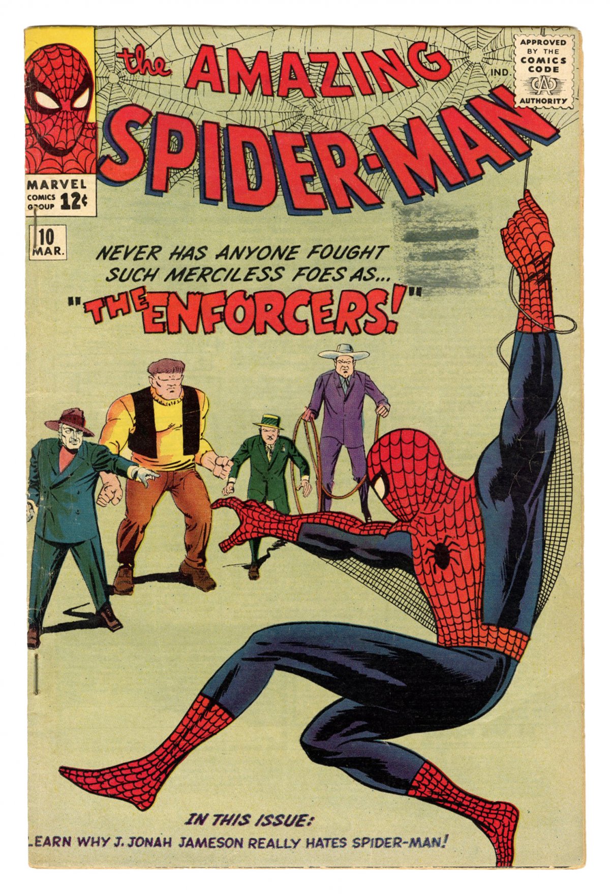 Amazing Spider-Man #10 finds Spidey getting one of his occasional breaks from battling deranged supervillains like Electro and Doc Ock, Sometime he'd simply enjoy life as the Friendly Neighborhood Spider-Man taking on colorful thugs. Stan Lee and Steve Ditko put that fun-loving formula to brilliant effect with the first appearance of the Enforcers as local muscle for the crime lord known as Big Man. The intimidating Ox, rope-slinging Montana, and high-kicking Fancy Dan would go on to become unlikely regulars in the Marvel Universe, battling heroes such as Daredevil and the Human Torch while ensuring this issue remains a classic collectible.