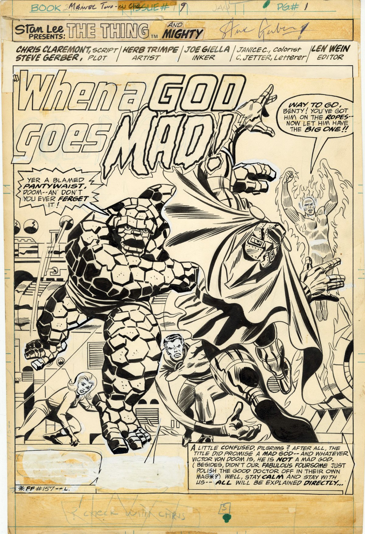 Dr. Doom vs the FF!Pen and ink. Art is in good condition, there are several missing paste-ups and the page shows light discoloration and handling wear. Signed by co-writer Steve Gerber.