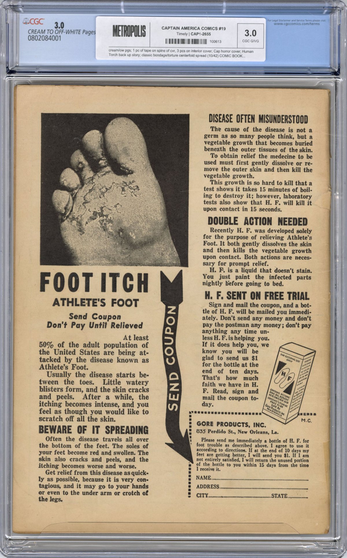 Cap horror cover; Human Torch back up story; classic bondage/torture centerfold spread (10/42) COMIC BOOK IMPACT rating of 7 (CBI)