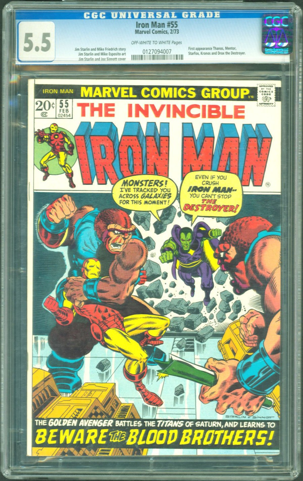 1st app of Thanos, Mentor, Drax the Destroyer, Starfox, Kronos, and the Blood Brothers; Jim Starlin story, cover, art.