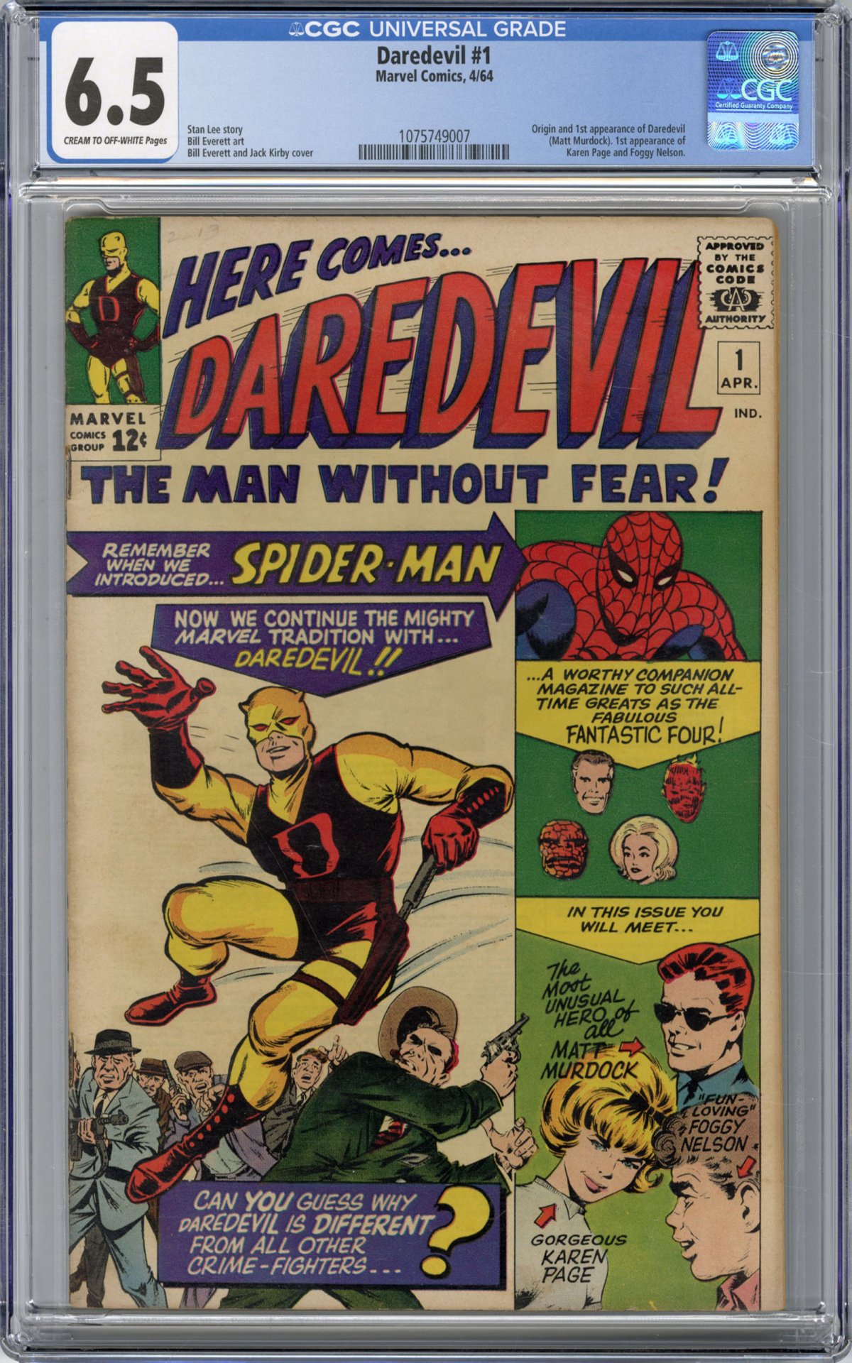 Daredevil (of course), but also has the first appearances of Foggy Nelson and Karen Page —who'd go on to become two of Marvel's favorite supporting characters. It all began with Stan Lee reviving an old comic character name (last used by Golden Age creator Charles Biro) and added the enticing gimmick of making their crime-fighting Daredevil the alter-ego of a blind lawyer. This inspired idea provided the new