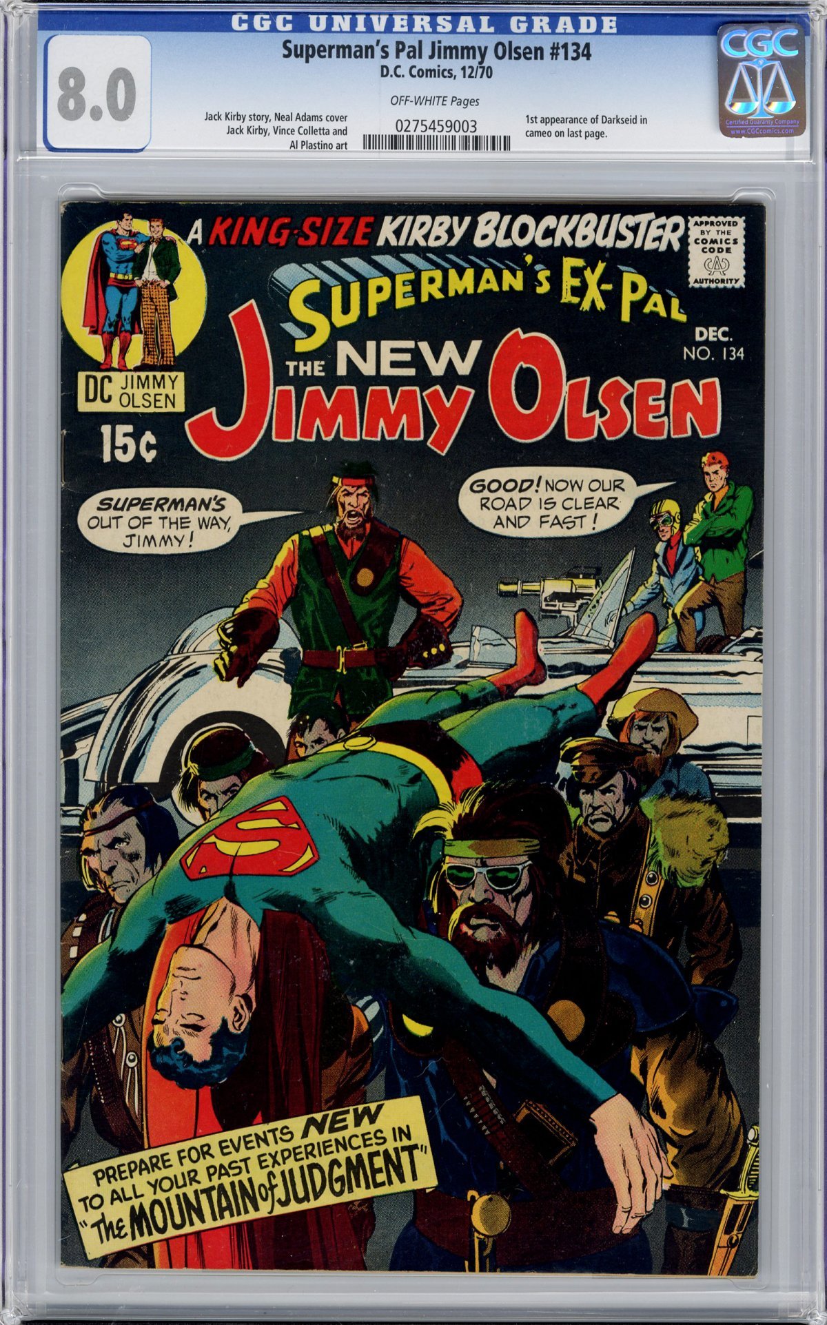 1st cameo app of Darkseid; Neal Adams cover; Jack Kirby art: COMIC BOOK IMPACT rating of 8 (CBI)In only his second issue of Superman’s Pal, Jimmy Olsen, Jack Kirby was off and running with his ambitious Fourth World concept, introducing “big bad” Darkseid to DC’s loyal fanbase and setting up the saga he had been planning while extracting himself from Marvel, a process that took the influential artist two years to complete. Kirby took on the floundering Olsen title because he liked the challenge of reviving DC’s lowest selling book, without costing anyone their job. Darkseid would continue to grow in importance and power long after Kirby’s departure from the scene and would become not only a central figure in DC’s mythos but also a challenging foe for Superman, the flagship character at the publishing house. They say humble beginnings lead to great things, and this issue represents the launch of one of the most iconic villains in the DC stable, who figures prominently in the DCEU movie franchise, making this a very desirable book for investment collectors.