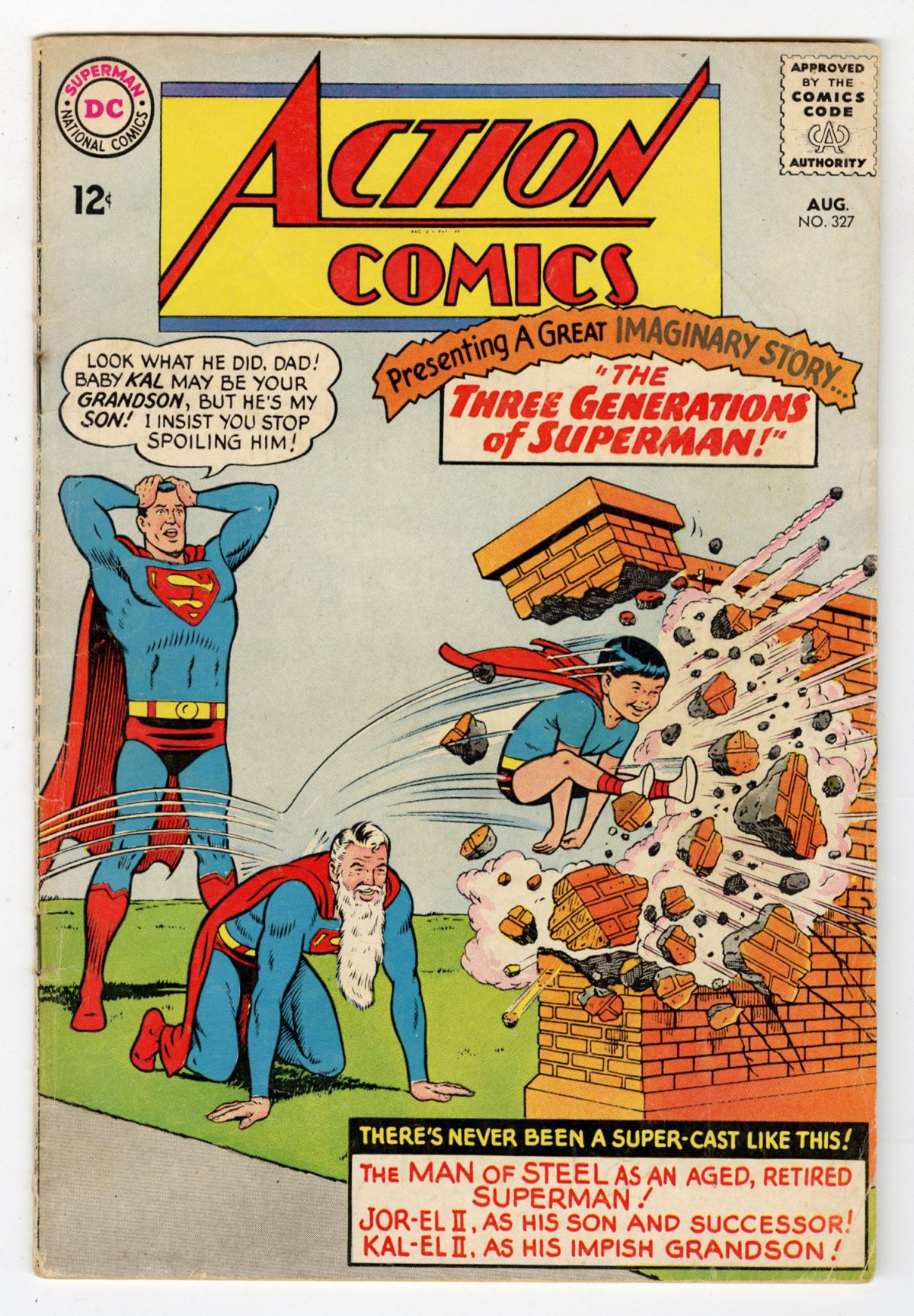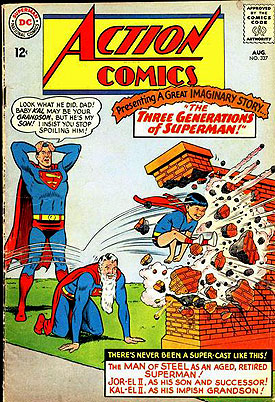 Swan cvr/art; COMIC BOOK IMPACT rating of 5 (CBI)Cover pencils by Curt Swan, inks by George Klein. Superman stars in an imaginary story, "The Three Generations of Superman!", script by Edmond Hamilton, pencils by Curt Swan, inks by George Klein; Superman I and Kal-El II discover a plot to invade the Earth. But can an aging hero and his super-young grandson save the day? How Superman Has Been Honored article recounting past stories. "Supergirl - Fugitive from Justice!", script by Leo Dorfman, art by Jim Mooney; Supergirl is accused of murder in another dimension and her worst accuser may be her cousin Superman!