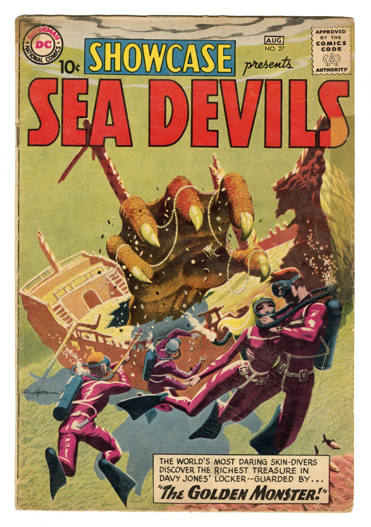 Russ Heath grey-tone cvr/art; origin & 1st app of Sea Devils; COMIC BOOK IMPACT rating of 7 (CBI)Cover art by Russ Heath. 1st appearance of Sea Devils in The Golden Monster!, script by Robert Kanigher, art by Russ Heath; SCUBA diver Dane Dorrance hopes to earn his Dad's UDT flippers; Judy Walton hopes to land the lead in the movie "Sea Devils"; Biff Bailey hopes to prove he's not a "clumsy ox"; Nicky Walton hopes to prove he's a man. The A-B-Seas of Skin Diving!, script by Robert Kanigher, pencils by Ross Andru, inks by Mike Esposito; Information on scuba diving, equipment, mysteries and joys; And "Never dive alone!" Monsters of the Seven Seas! article. Ad for The Many Loves of Dobie Gillis, art by Bob Oksner.