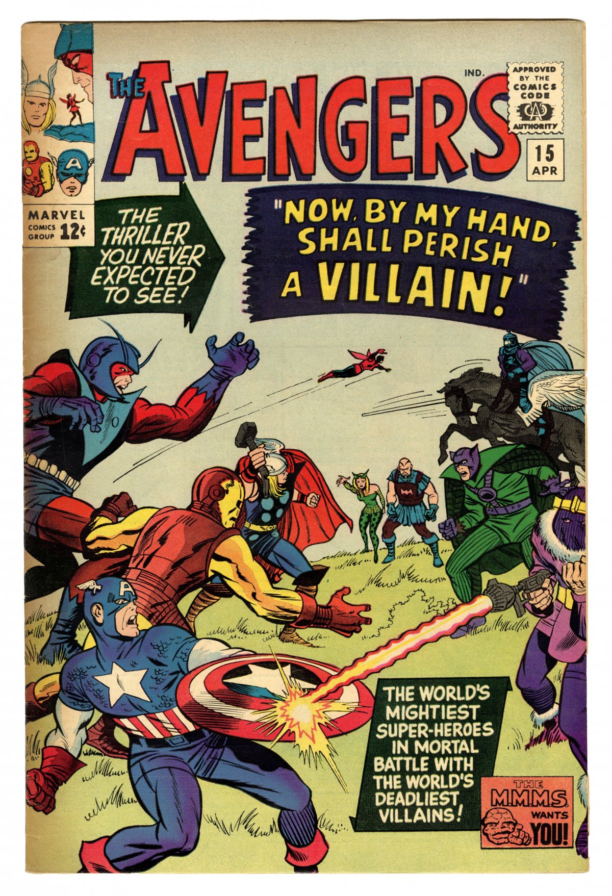 Jack Kirby cover; "Death" of Baron Heinrich Zemo; COMIC BOOK IMPACT rating of 6 (CBI)"Now, By My Hand, Shall Die a Villain!" Script by Stan Lee, layouts by Jack Kirby, pencils by Don Heck, inks by Mike Esposito (as Mickey Demeo). Avengers Roll Call: Thor, Captain America, Iron Man, Giant Man, Wasp, and Rick Jones. Villains: the first Baron Zemo, the Enchantress, the Executioner, the Melter, the second Black Knight, and the first appearance of Zemo's Mercenaries (Erik Josten). Baron Zemo is killed when a laser ray, he fires, reflects off of Captain America's shield and causes an avalanche that buries the baron underneath a ton of rock.