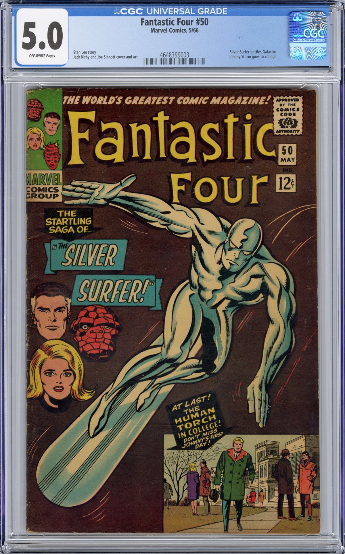 classic Jack Kirby cvr/art; Silver Surfer vs. Galactus; 1st app of Wyatt Wingfoot; Johnny Storm goes to collegeThe Surfer was famously dropped into his first appearance by Jack Kirby without warning his collaborator, Stan Lee, who was first bemused then intrigued by this bizarre and inventive new addition to the rapidly ballooning FF galaxy. By his third appearance in this landmark issue, Lee had solidified a tragic, Shakespearean arc for the new character, pitting him against his galactic master with the universe at stake and gracing him with tortured inner monologues and a questing spirit. The proof of the character's near-instantaneous acceptance with Marvel's increasingly college-aged readership is seen on this classic cover, where the upstart antagonist completely steals the focus from the book's supposed leads. Note the Thing's bewilderment at this unexpected turn of events.
