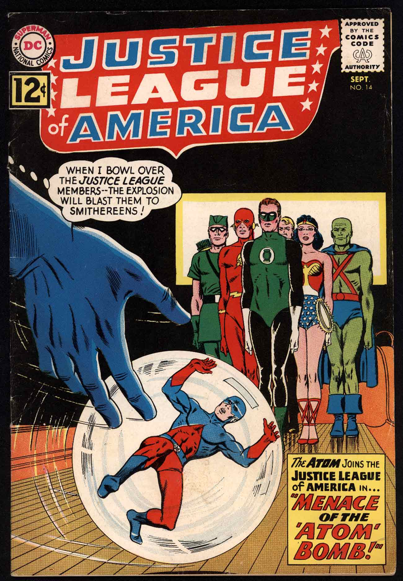 Murphy Anderson cover/art; Mike Sekowsky/Bernard Sachs inks; Atom joins the Justice League of America;Much like the Golden Age Atom was a member of the JSA, in issue #14 of JLA, the rebooted Silver Age Atom joins the hero team after a bit of a mystery is unraveled by the superteam. It seems when the League is considering a new hero to enlist to the group, they all vote for the Atom, but none of them seem to remember who exactly that is, after encountering the miniature hero, who has also forgotten his identity, everyone comes to their senses and hones in on their antagonist, one Mister Memory, who has even roped Batman into the confusion and chaos. And, yes, dear reader, the cover does not lie, there is a sinister bowling pin plot woven into this tale as well. But fear not, all is set right by the comic’s conclusion, and the Atom ends up joining forces with the JLA, and peace once again reigns over the land, at least until the next issue.