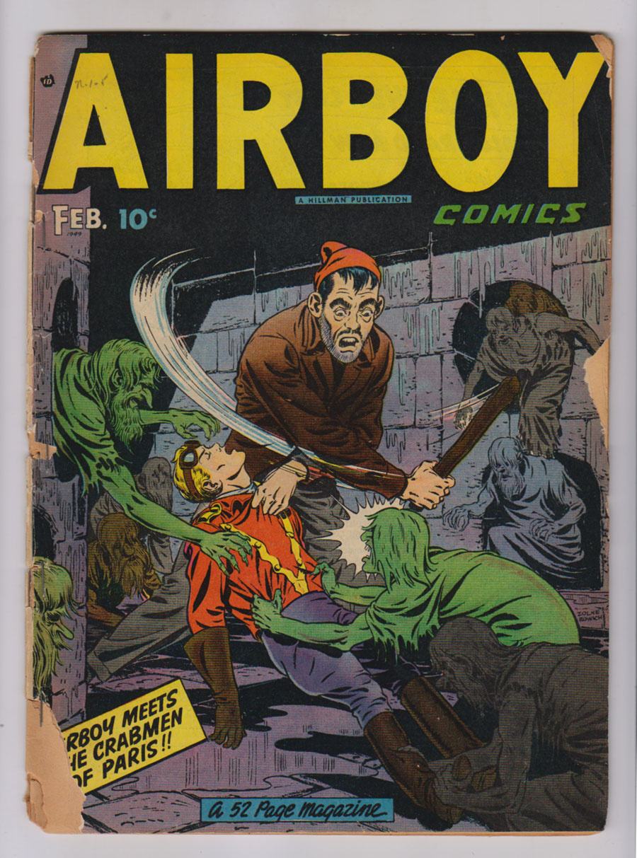 Kids were clamoring for Airboy Comics during World War II, as Hillman Publications cashed in on the costumed identity of young pilot Davy Nelson II. The character was the creation of legendary scribes Charles Biro and Dick Wood, originally working with artist Al Camy. Airboy would first find a home as the cover star of Air Fighters Comics #2, starting with the second issue in Nov. 1942. The Nazi-bashing star (assisted by his high-tech plane Birdie) would see the title change to Airboy Comics in 1945. Al Carny would later be replaced by Tony DiPreta and then Fred Kida before Ernie Schroeder closed out the series, while the backing stories featured talents like Jack Kirby & Joe Simon, Dan Barry, and Carmine Infantino.