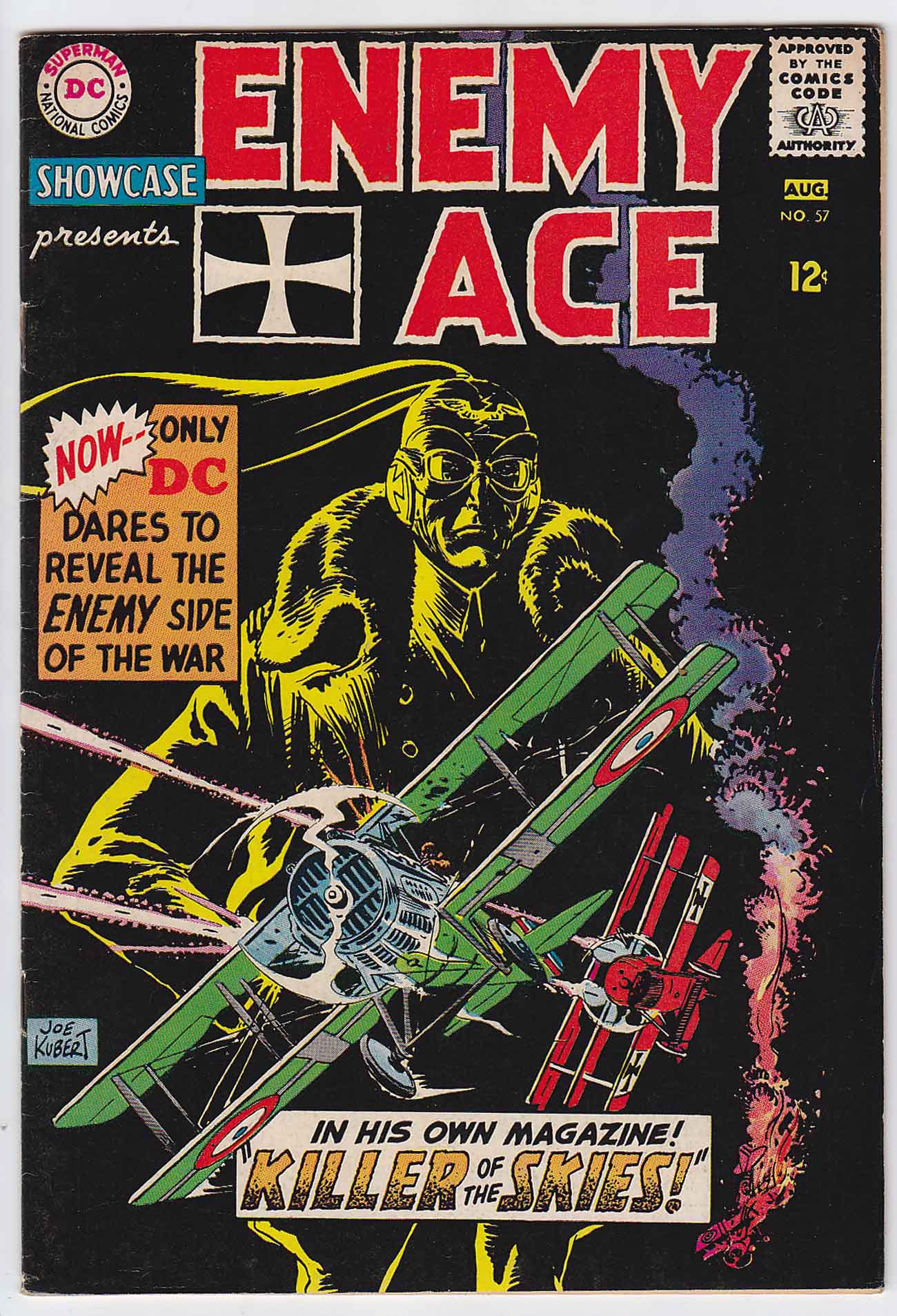 4th overall appearance of Enemy Ace. Cover art by Joe Kubert. Killer Of The Skies! starring Enemy Ace, script by Robert Kanigher, art by Joe Kubert; The Enemy Ace faces off agains The Hunter, a Canadian Ace, over No-Man's Land.