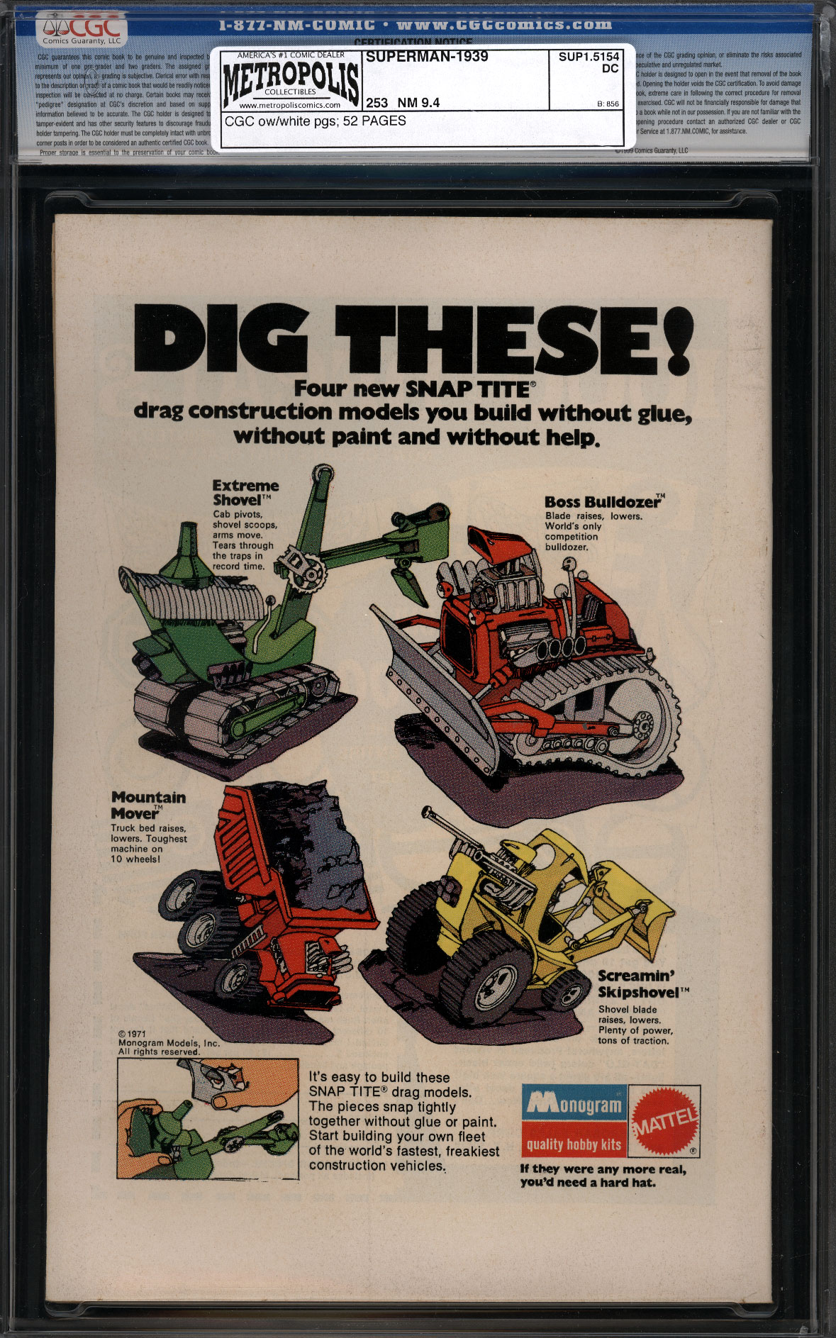 52 pgs; Cardy cover + Swan art; COMIC BOOK IMPACT rating of 5 (CBI)Cover art by Nick Cardy. The Kid Who Saved Superman! starring Ferlin Nyxly, Superman, Morgan Edge, Lois Lane, Dr. Ezra Royko, Sourdough Jim, Dr. Farr, Billy Anders;, Mr. Duffy, and Martian Manhunter [J'onn J'onzz], script by Denny O'Neil, pencils by Curt Swan, inks by Murphy Anderson. Another Ice Age!—Just Imagine, art by Virgil Finlay. Untitled Superman story, script by Jerry Siegel, art by Leo Novak.