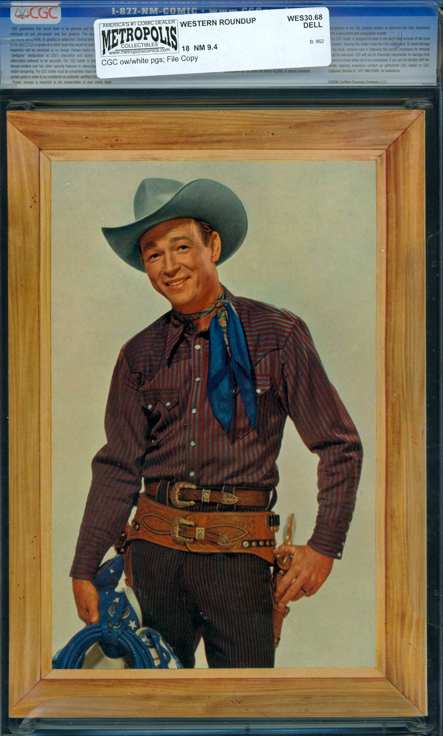 File CopyPhoto cover with Gene Autry, Roy Rogers, Johnny Mack Brown, Dale Evans, and Rex Allen. Cover art by Sam Savitt. Virginia City Queen of the Ghost Towns text story. The Last Draw starring Gene Autry. The Man Hunt starring Roy Rogers. Double Delivery starring Bullet and Trigger. Hidden Treasure starring Flying A's Range Rider, art by Alex Toth. The Chisholm Trail text article. Rex Allen and the Prisoner, art by Mike Arens. The Setup starring Law Man, art by Bill Ziegler. Buffalo Jones starring The Frontiersmen. Mystery in Pine Canyon starring Johnny Mack Brown, art by Bill Ziegler. A Fool's Gold strarring Queen of the West Dale Evans, art by Nicholas Firfires. Color photo of Roy Rogers. 100 Pages,