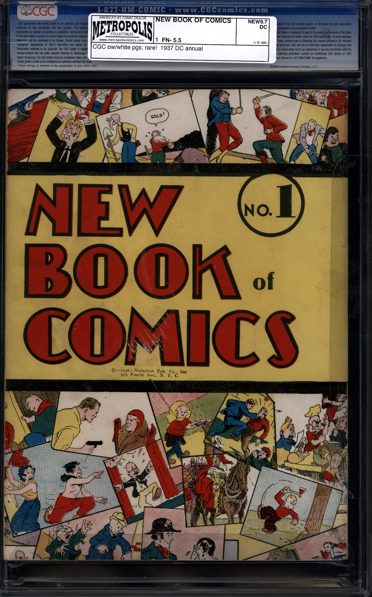 Shuster, Sullivan, Moldoff art (his first); 1937 DC Annual (the second); Comic Book Impact rating of 8 (CBI)Having seen some success with the previous year's Big Book of Fun, DC hurriedly prepared a doorstop followup, the New Book of Comics, a massive 100-page monster of a comic that featured many of the talents that were soon to shake up the industry in the oncoming superhero craze. The bright, colorful pastiche cover did its job nicely, and the book sold in healthy numbers, though surprisingly few survive to this day, making this certainly one of the five rarest DC comics ever published.