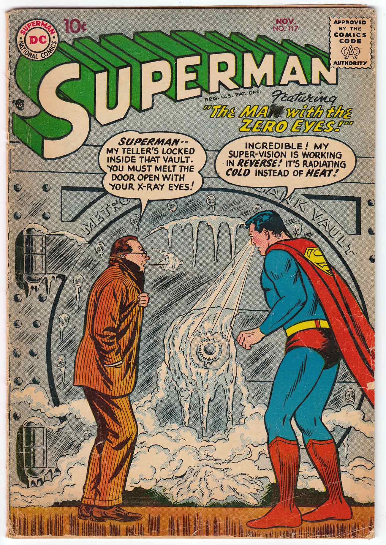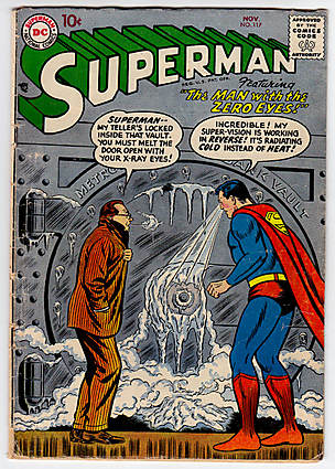 Clark Kent, Man of Mystery; COMIC BOOK IMPACT rating of 5 (CBI)Cover pencils by Curt Swan, inks by Stan Kaye. Clark Kent, Man of Mystery starring Superman, script by Otto Binder, pencils by Wayne Boring, inks by Stan Kaye. The Secret of Fort Superman starring Superman and Lex Luthor, script by Otto Binder, pencils by Wayne Boring, inks by Stan Kaye. The Man With the Zero Eyes starring Superman and Rex Chalmers, art by Al Plastino; Superman's heat vision (called super-vision here) is cold instead of hot.