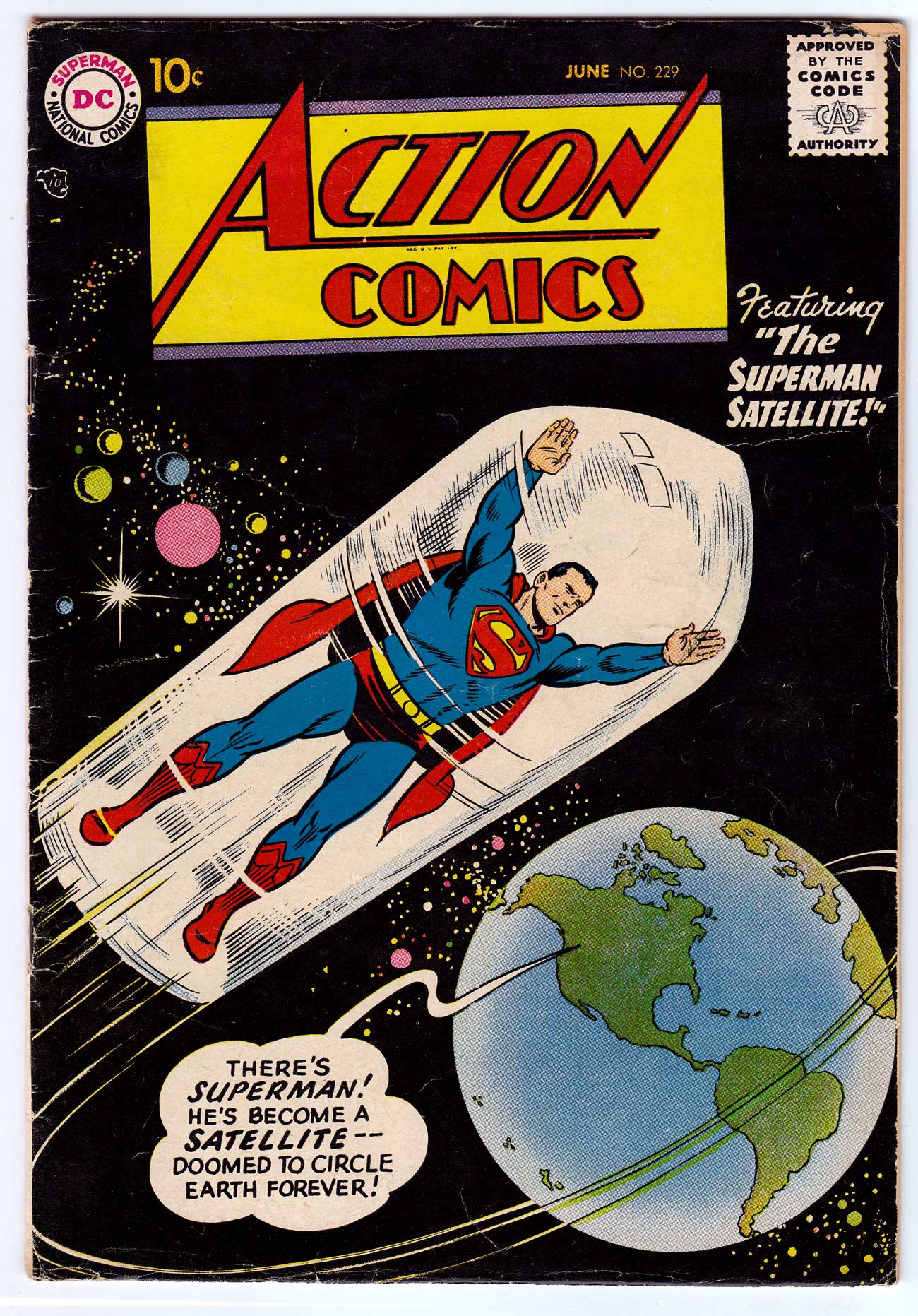 Plastino outer space coverCover by Al Plastino. "The Superman Satellite," script by Edmond Hamilton, pencils by Wayne Boring, inks by Stan Kaye; After destroying an asteroid in space, Superman is informed that he has become poisonous and that he must never touch the Earth again. "The Great Jungle Swindle" starring Congo Bill and Janu the Jungle Boy, script by Jack Miller, art by Nick Cardy. Half-page Varsity Vic story by Henry Boltinoff. Games That Save Lives article. "The Milky Way Hunt," script by Otto Binder, art by Jim Mooney.