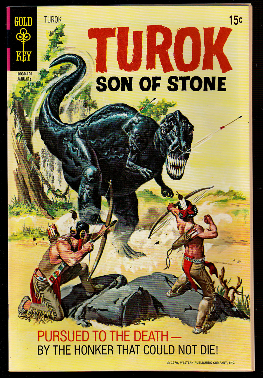 File CopyPainted cover. Turok in "The Deathless Honker" "Part 1: Tracking The Terror" and "Part 2: Pursuit to the Death" in which Turok and Andar battle a dinosaur that will not die. Issue also has backup feature "Young Earth - Body Decorations," a one-page text feature "The Mysterious Ruins," and Gold Key Comics Club News features.