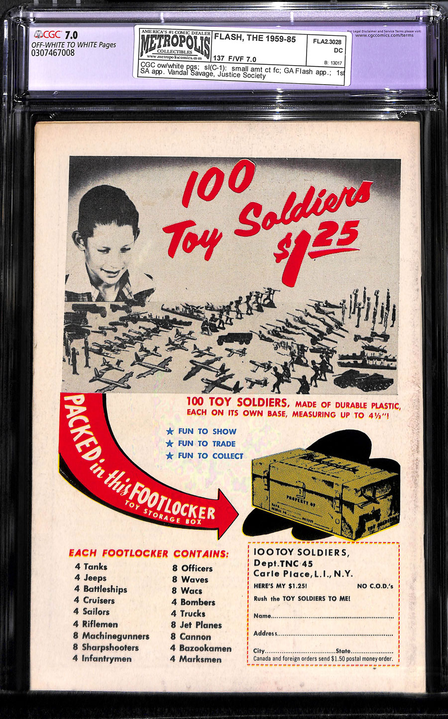 GA Flash app; 1st SA app Vandal Savage, 2nd SA app Justice Society (key issue alert!)Vandal Savage is a villain that, as legend has it, existed from the beginning of mankind, in a variety of forms, immortal yet mutable, the Vandal has traveled the eons in the guise of many historical figures of reknown. Beginning life in the Golden Age as a foe of the original Green Lantern, VS made his first appearance in the Silver Age in Flash #137, and went on to acheive greater and greater heights and status as the ages moved through to the modern day, Appearing in TV's Arrowverse, Vandal Savage is now more popular than ever, and remains one of the enduring ne'er-do-wells of DC stable, and in this issue Vandal Savage is thwarted in his plans to imprison the JSA on Earth-Two, which leads to the GA hero team's permanent reunion.