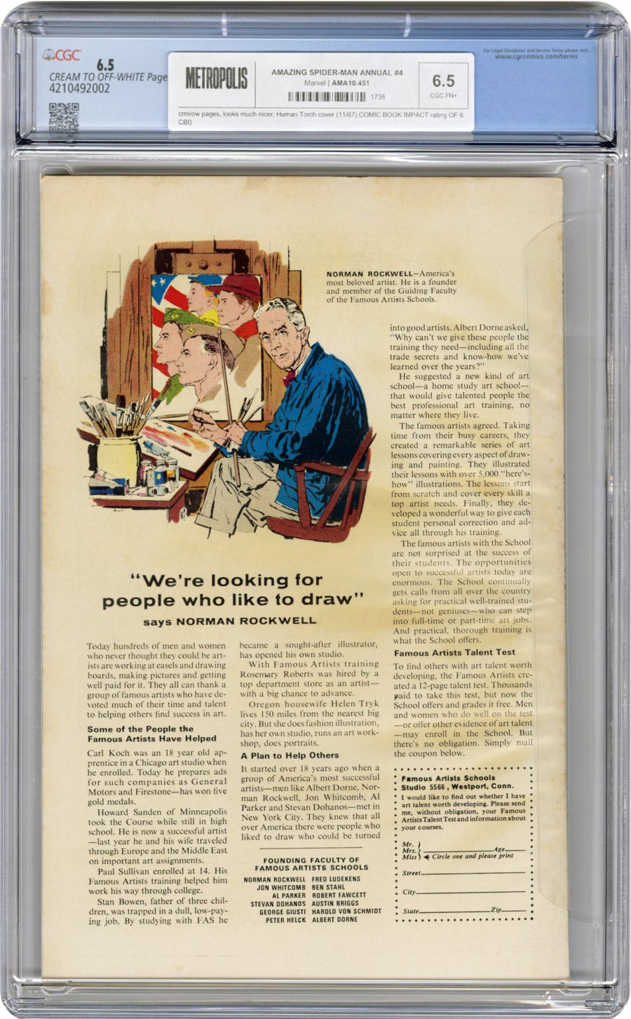 Human Torch cover (11/67) COMIC BOOK IMPACT rating OF 6 CBI)All-new 41-page story "The Web and the Flame!" Guest-starring the Human Torch. Script by Stan Lee. Pencils by Larry Lieber. Inks by Mike Esposito (aka Mickey Demeo) and Tony Mortellaro. Cover by Larry Lieber and Mike Esposito. The action starts with a bang as the Amazing Spider-Man spies the Human Torch running amok through the heart of Manhattan! What has gotten into Johnny Storm? The web-slinger swoops into stop the torch and discovers that the fiery member of the FF is just filming a movie! The embarrassed wall-crawler quickly departs, but an observant super-villain nearby begins to formulate a devious plan! One thing leads to another and both Spidey and the torch are invited to shoot a brand new movie in Hollywood! But the duo might want to check the identities of the director and producer first! After a mishap on the set, the temporary teammates at last find their adversaries and a giant mechanical gorilla! Roll the cameras for Spider-Man and the Human Torch vs. Mysterio and the Wizard! Cameo appearances by J. Jonah Jameson and actress Elizabeth Taylor. First backup feature: "The Coffee Bean Barn" Two-page illustration of Peter Parker and his friends. Script by Stan Lee. Pencils by Larry Lieber. Inks by Mike Esposito. Second backup feature: "What the Well-Dressed Spider-Man Will Wear" Two-page illustration of the web-slinger's costume and web-shooter. Third backup feature: "Spidey's Greatest Talent" Four-page illustration of the wall-crawler's powers. Fourth backup feature: One-page pin-up of Spider-Man with the Thing, Thor, Hercules, Sub-Mariner, and the Hulk. Art by Larry Lieber, Jack Kirby, and Mike Esposito. Fifth backup feature: "Say Hello to Spidey's Favorite Foes!" Two-page illustration of eight favorite foes including Dr. Octopus and the Green Goblin. Art by Larry Lieber, John Romita, Jack Kirby, Mike Esposito, and Joe Sinnott. Sixth backup feature: "A Visit to Petey's Pad!" Two-page illustration of Peter Parker and Harry Osborn's apartment. (Notes: Mysterio battles the web-slinger again in Amazing Spider-Man 66 & 67. John Romita contributed pencils to the inside front cover splash page.