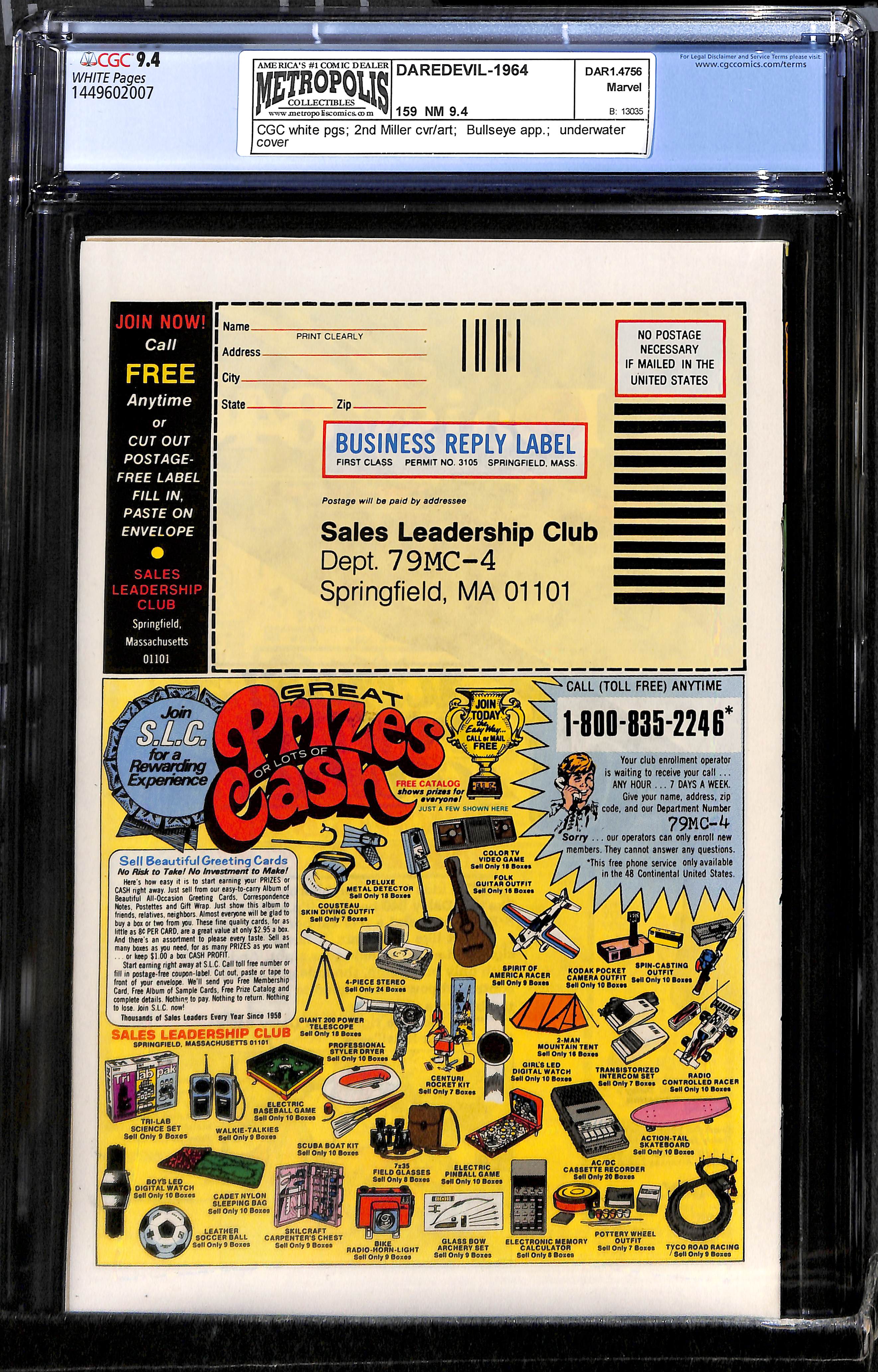 2nd Miller cover/art; Bullseye app; underwater cover; COMIC BOOK IMPACT rating of 6 (CBI)secrets of Daredevil's billy club last page