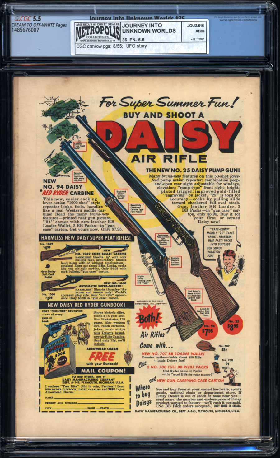 8/55 UFO storyCover art by Carl Burgos. The Giants, art by Paul Reinman; An archeologist wills himself back into the past, discovers that a race of intelligent good-humored "mutant giants" coexisted with Pithecanthropus erectus, and sets in motion a chain of events which wipes out the race of giants. The Appointment text story. Calculated Risk, art by Mac L. Pakula; A story told from the point of view of a robot who is kept under guard while scientists use him to answer calculations bearing on questions of national security. Down to the Sea!, art by Jack Katz; A sea captain in love with the sea is saved by the sea after it wrecks his vessel. Flying Saucer!, art by Manny Stallman; An alien gets the idea of installing flying saucer rides in amusement parks as a way of calming fears about flying saucers. The Wonder Maker!, art by Sid Greene.