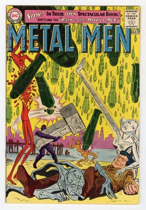 Andru/Esposito cvr/art; animated Metal Men movie in the works; COMIC BOOK IMPACT rating of 7 (CBI)Starting life in the famed “test” anthology title Showcase, DC’s Metal Men garnered a cult following strong enough to earn them their own book, which was cancelled after interest waned, but the team kept reappearing over the decades and are now the subject of a rumored movie project to be helmed by "Men In Black" director Barry Sonnenfeld, proving the staying power of this unique team of elemental heroes. In the premiere issue of Metal Men, the devious rocket being Z-1, of the Missile Men, send his minions to Earth in search of a suitable mate. Upon the discovery of the highly emotional Metal Men team member, Platinum aka Tina, Z-1 decides to claim her for himself, and attacks Earth in a bid to capture his bride. The other Metal Men (Gold, Tin, Lead, Iron, and Mercury) are able to defeat the evil missile and save their teammate along with a hand from their creator, Dr. Will Magnus, and return to their fashion magazine photo shoot without skipping a beat. The slightly oddball nature of this title is what originally earned the team’s fan base, much to the delight of writer Robert Kanigher and penciler Ross Andru.