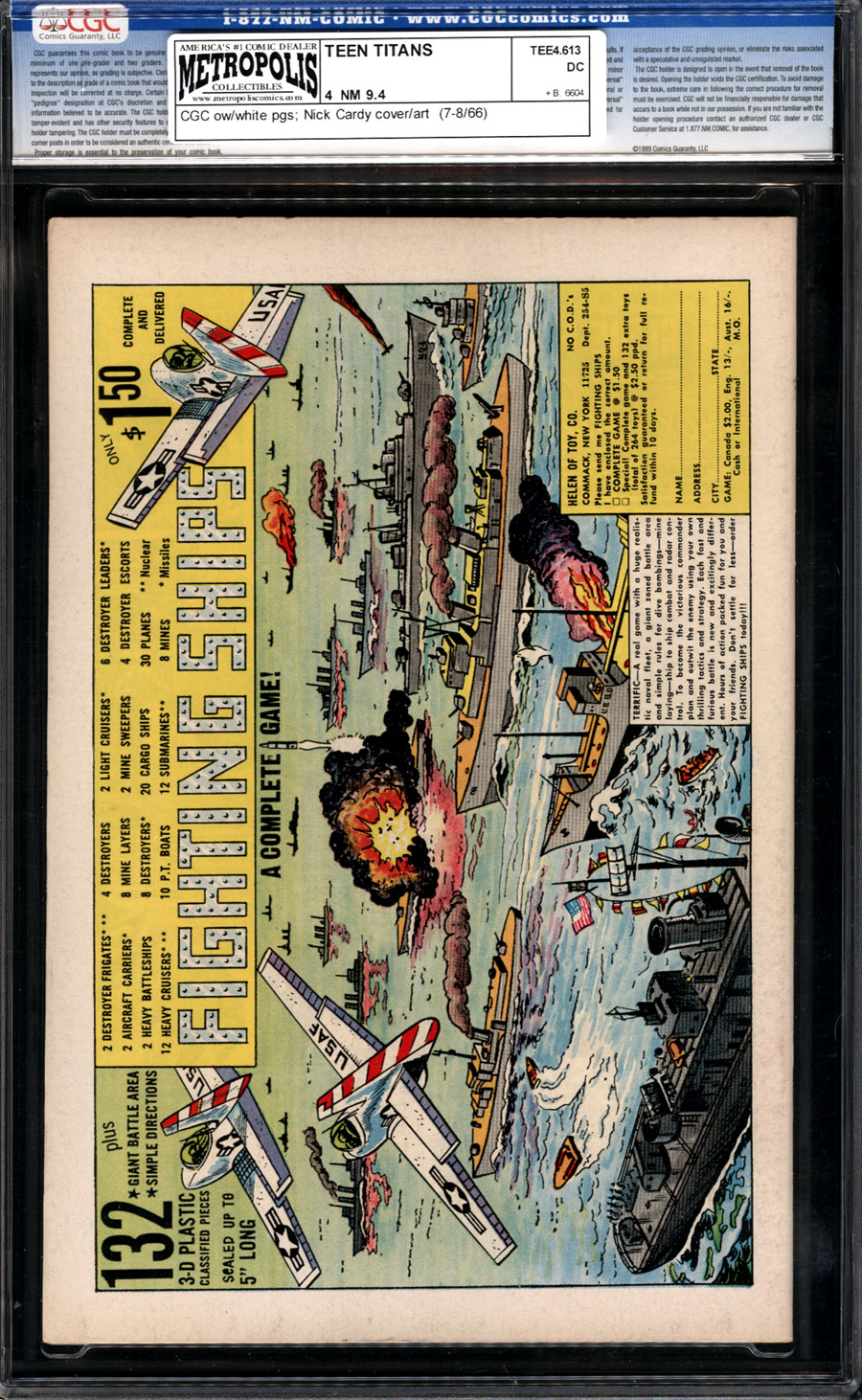 Nick Cardi (Nicholas Viscardi) was an American comics artist best known for his DC Comics work on Aquaman, the Teen Titans and other major characters. Cardy was inducted into the Will Eisner Comic Book Hall of Fame in 2005. Cardy entered the comics field working for the Eisner/Iger studio, joining circa 1940, he worked on Fight Comics, Jungle Comics, Kaanga Comics, and Wings for Fiction House Publications. He wrote and drew the four-page backup feature "Lady Luck" in Will Eisner's 16-page, Spirit Section, from the May 18, 1941 strip through February 22, 1942. In 1950, Cardy began his decades-long association with DC Comics, starting with the comic book Gang Busters, developing his breakout reputation with Tomahawk, his most prominent series at the time. From 1962–1968, he drew the first 39 issues of Aquaman, whose character had previously starred in a backup feature in Adventure Comics, and all its covers through the final issue (#56, April 1971). Cardy first drew the Teen Titans in The Brave and the Bold #60 (July 1965), wherein the superhero sidekicks Robin, Kid Flash, and Aqualad were joined by Wonder Woman's younger sister Wonder Girl in her first appearance. After next being featured in Showcase #59 (Dec. 1965), the team was spun off into their own series with Teen Titans #1 (Feb. 1966). From 1966–73, Cardy penciled or inked – sometimes both – all 43 issues of the series. Cardy left the comics industry in the mid-1970's for the more lucrative field of commercial art. There, under the name Nick Cardi, he did magazine art and ad illustrations, including movie advertising art (though not necessarily the "one-sheet" posters) for films including The Street Fighter (1974), The Night They Robbed Big Bertha's (1975), Neil Simon's California Suite (1978), Stanley Donen's Movie Movie (1978), Martin Ritt's Casey's Shadow (1978), and Francis Ford Coppola's Apocalypse Now (1979).