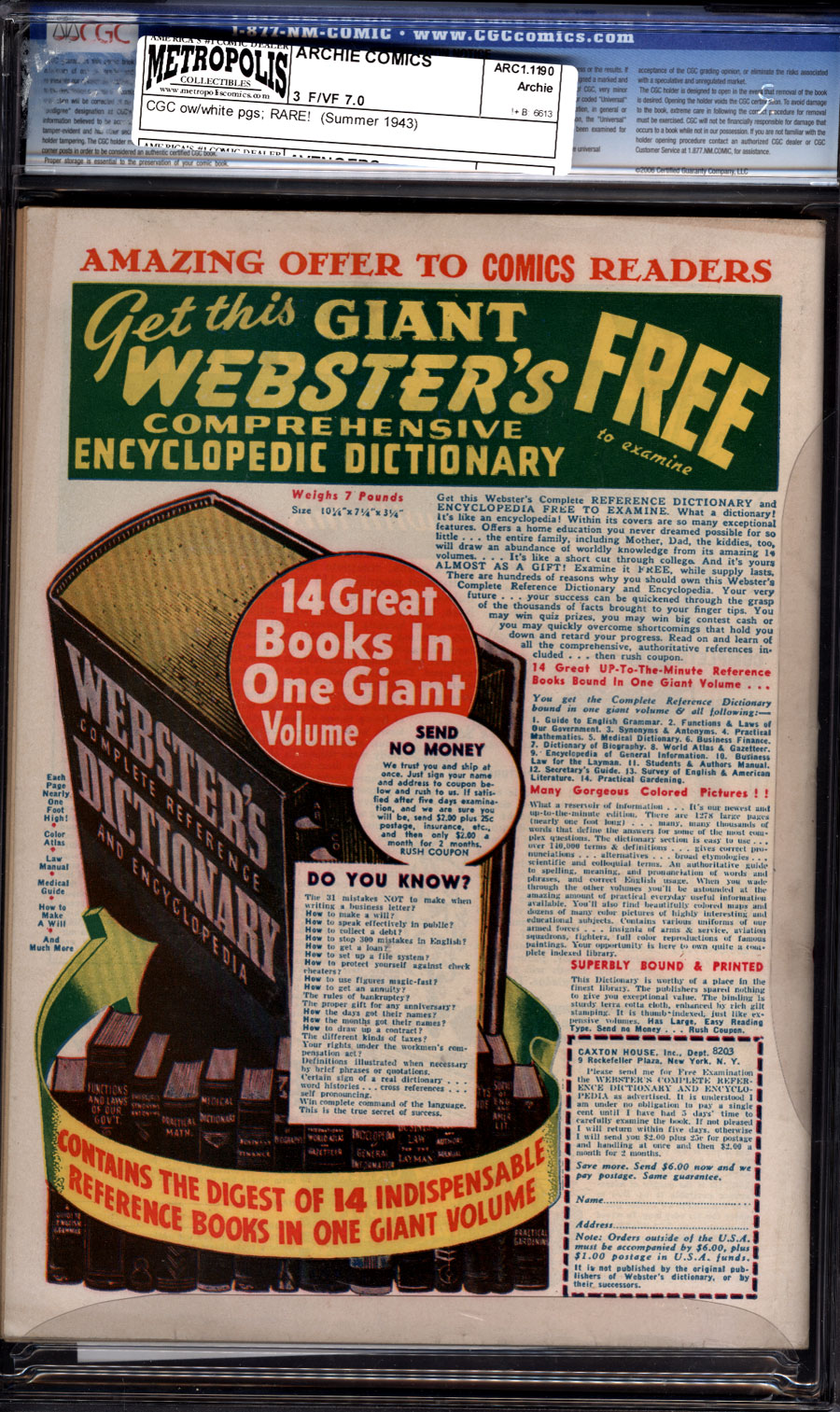 Harry Sahle cover/art; baseball story (Summer 1943) COMIC BOOK IMPACT rating of 6 (CBI)Finally! Archie #3 offers the first of his enduring love-triangle images, this is the quintessential Archie cover, Betty and Veronica, literally shooting Archie "daggers" with their eyes. Of course Jughead is of little help to the terribly aloof teenager, leaving our bow-tied ginger to sweat out the ultimate dilemma, whom to take to the prom? This is a boilerplate storyline that is still used regularly in Archie's long, long, stint in the world of comics.ÿý