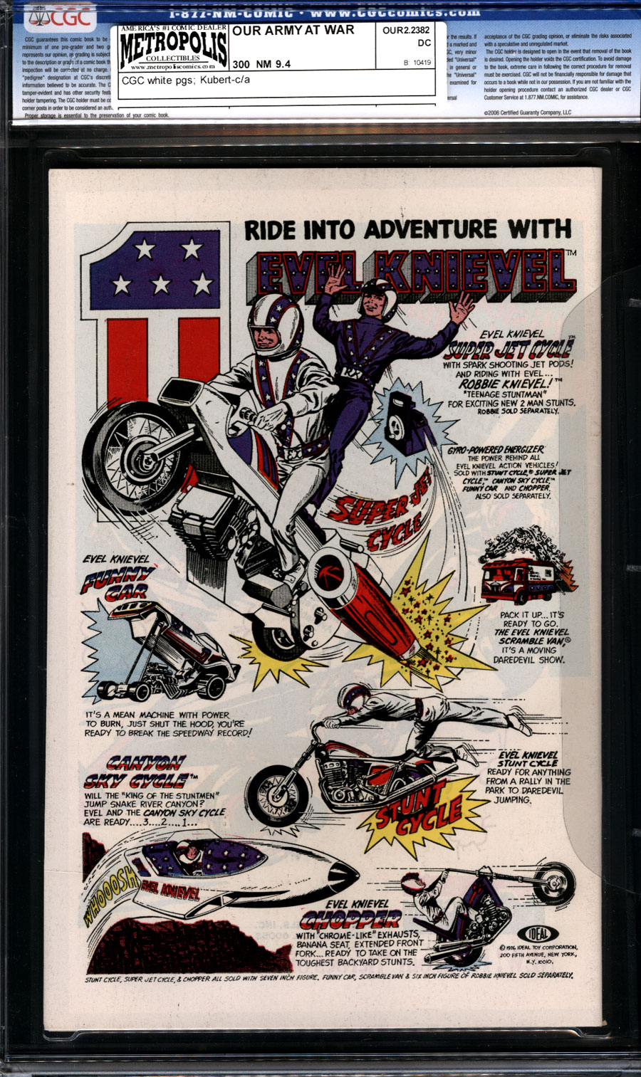 classic Kubert cover; COMIC BOOK IMPACT rating of 6 (CBI)Joe Kubert art for this special issue in "300th Hill." (Script by Bob Kanigher.) Back-up story, "Numero Uno!" Script by Kanigher, art by Lee Elias. Batman stars in a one-page Hostess ad, "The Muse." Kubert cover.