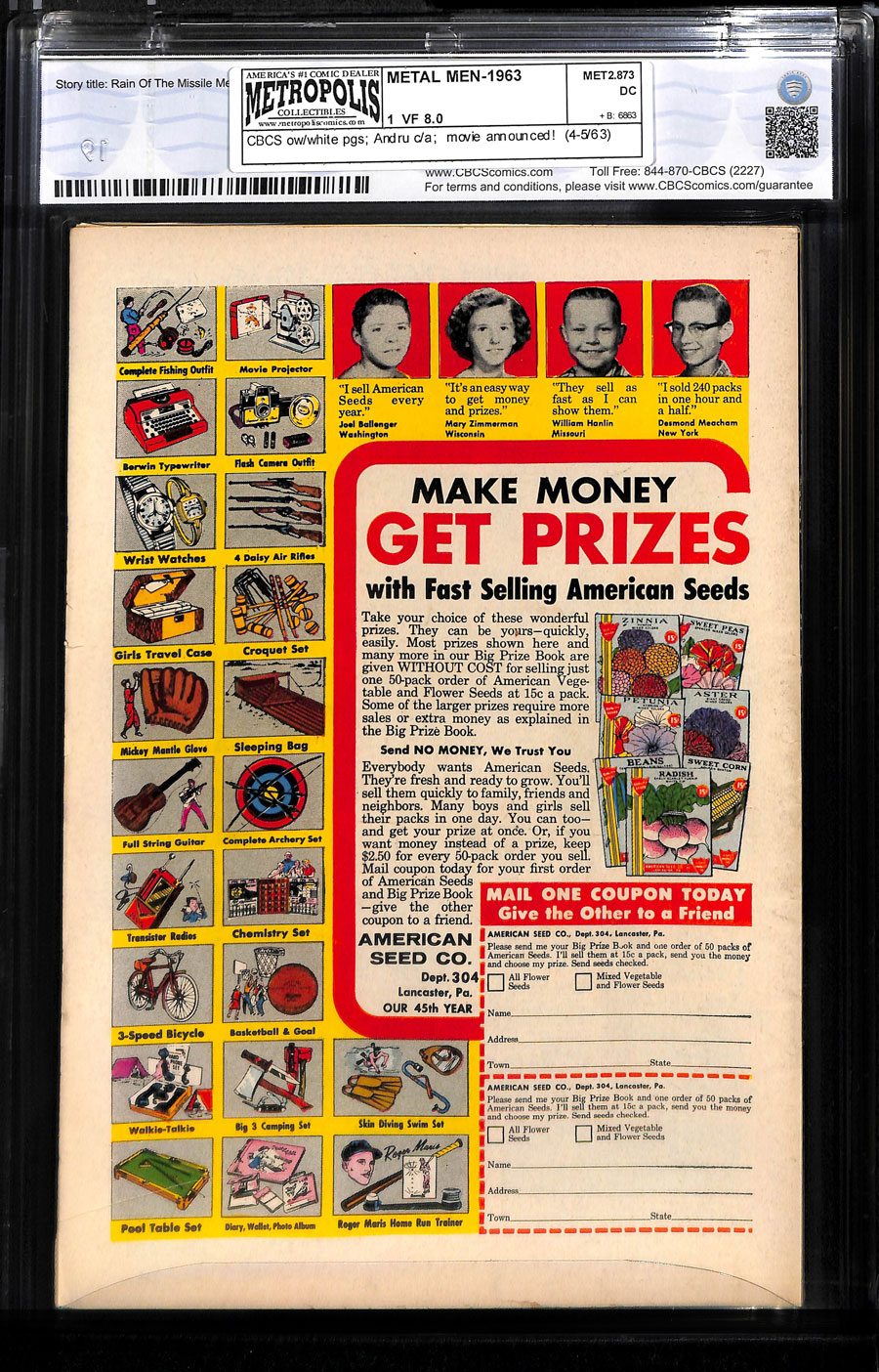 Andru/Esposito cvr/art; COMIC BOOK IMPACT rating of 7 (CBI)Starting life in the famed “test” anthology title Showcase, DC’s Metal Men garnered a cult following strong enough to earn them their own book, which was cancelled after interest waned, but the team kept reappearing over the decades and are now the subject of a rumored movie project to be helmed by "Men In Black" director Barry Sonnenfeld, proving the staying power of this unique team of elemental heroes. In the premiere issue of Metal Men, the devious rocket being Z-1, of the Missile Men, send his minions to Earth in search of a suitable mate. Upon the discovery of the highly emotional Metal Men team member, Platinum aka Tina, Z-1 decides to claim her for himself, and attacks Earth in a bid to capture his bride. The other Metal Men (Gold, Tin, Lead, Iron, and Mercury) are able to defeat the evil missile and save their teammate along with a hand from their creator, Dr. Will Magnus, and return to their fashion magazine photo shoot without skipping a beat. The slightly oddball nature of this title is what originally earned the team’s fan base, much to the delight of writer Robert Kanigher and penciler Ross Andru.