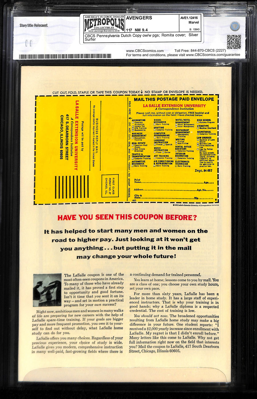 Pennsylvania Dutch Copy"Holocaust" Avengers-Defenders crossover. Part 5 of 8. Guest-starring the Defenders and Sunfire. Script by Steve Englehart. Pencils by Bob Brown. Inks by Mike Esposito and Frank McLaughlin. Cover by John Romita and Mike Esposito. Story continues from Defenders 9. The Dread Dormammu is shocked to discover that the Avengers are battling the Defenders for the Evil Eye! However, the Defenders are having success, so he elects not to intervene at the moment. In the Southern hemisphere, a Bolivian castle is the setting for the next superhero showdown featuring superior swordplay! Valkyrie enters the castle first, but the former super-villain turned avenger interrupts her search! The Asgardian defender has the edge in strength, while the Swordsman has the edge in skill! Which warrior will prevail? Meanwhile on the other side of the world in Japan, the stage is set for a classic confrontation! Captain America vs. the Sub-Mariner! These two men previously fought as allies in the Land of the Rising Sun during World War II, but today they fight as adversaries for the Evil Eye! Just an awesome battle! And it gets even better when Sunfire joins the mix! A fantastic issue!