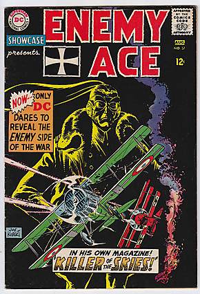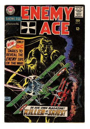 1st Enemy Ace tryout issue by Joe Kubert (cvr/art); COMIC BOOK IMPACT rating of 6 (CBI)4th overall appearance of Enemy Ace. Cover art by Joe Kubert. Killer Of The Skies! starring Enemy Ace, script by Robert Kanigher, art by Joe Kubert; The Enemy Ace faces off agains The Hunter, a Canadian Ace, over No-Man's Land.