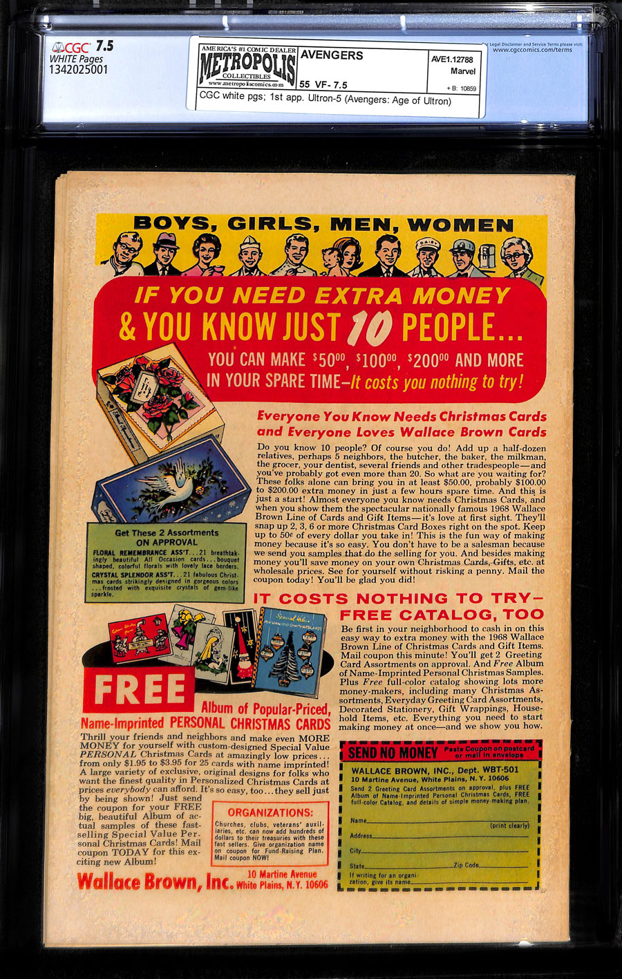 1st app of Ultron-5, Crimson Cowl revealed to be Ultron-5; COMIC BOOK IMPACT rating of 7 (CBI)"Mayhem Over Manhattan" indeed, this thrilling cover piece by John Buscema shows the Avengers doing battle with the The Masters of Evil, a team of villains comprised of Klaw, the Radioactive Man, Whirlwind, the Melter, and one Crimson Cowl, who is actually Ultron-5 in disguise. Yes friends, this is the comic book which features the first (full) appearance of the evil robot that would inspire the box office blockbuster Avengers: Age of Ultron, which is worth the price of admission alone, but wait, there's more, Hawkeye, Goliath, Black Panther, and the Wasp are all in on the action as well as a guest appearance by the Black Knight, who will probably have his own movie or TV series at some point...this is a "must-have" book for Avenger fans.