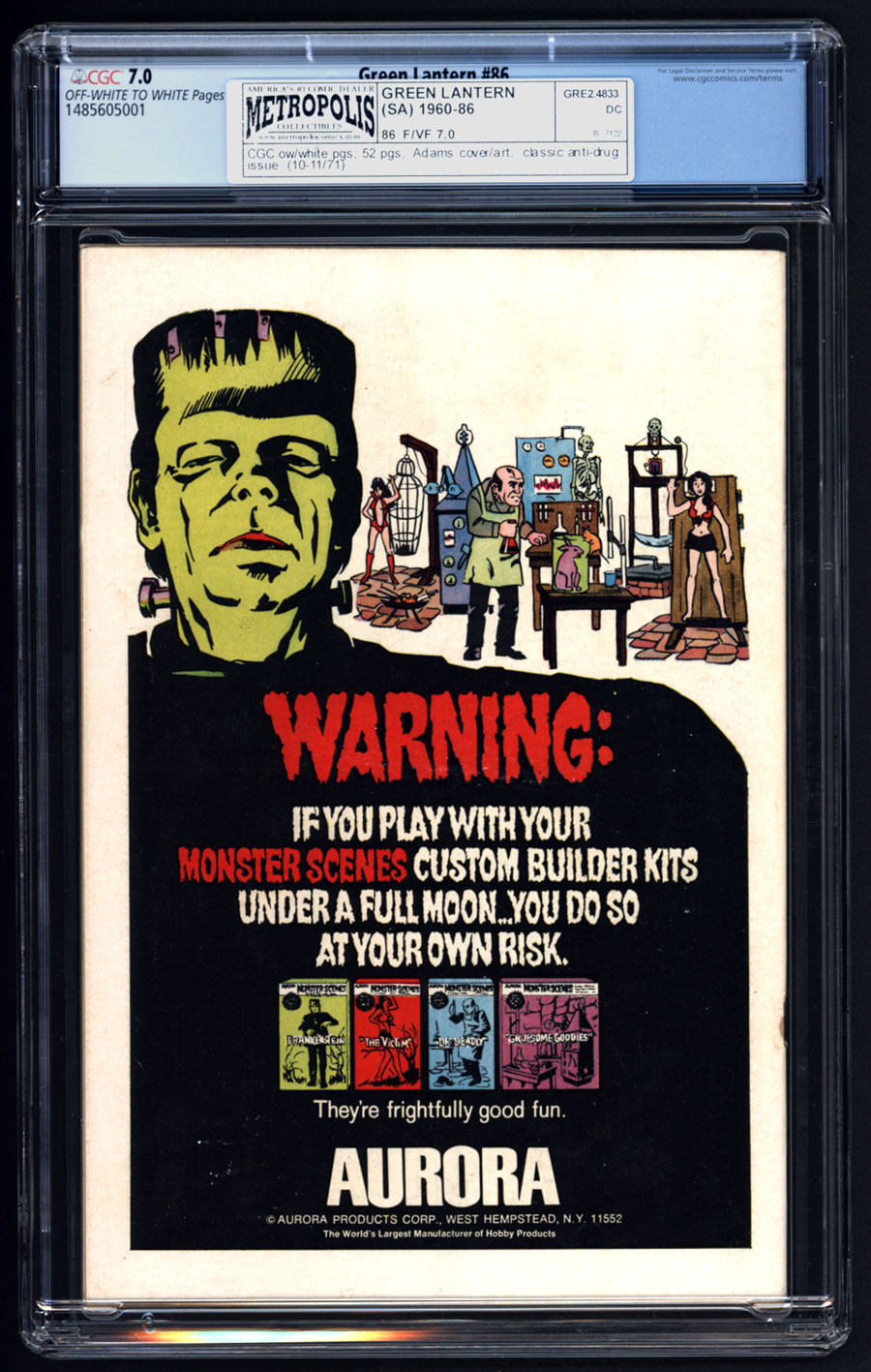 Continuing the legendary and boundary breaking storyline from Green Lantern #85, this issue delves deeper into the damage and corruption underpinning the heroin trade. After revealing his drug addiction in the previous issue, Speedy proclaims he will quit, cold turkey, to spite Green Arrow for rejecting and beating him, and he goes to Dinah Lance’s home to dry out. Meanwhile, GL/GA are in hot pursuit of Speedy’s junkie “friends,” and once they catch up to them, they discover one has died of an overdose, a sequence which inspired the memorable Neal Adams cover design. The pair of heroes eventually track down the pusher behind the influx of heroin, trace him to his Caribbean island hideout and dispatch him and his lab technician. The story ends with a somber funeral and a heartfelt conversation between the newly clean Speedy and his father figure, Green Arrow. This comic, along with the previous issue are considered classics of the Bronze Age, that helped push the envelope and redefine what comic books were all about, both issues remain desired collectibles and continue to make a strong showing in the auction marketplace.