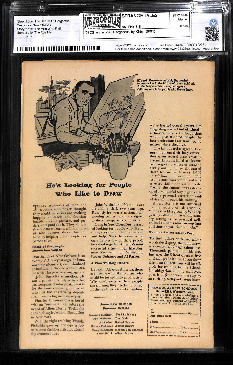 Jack Kirby cvr/art, Ditko art; GARGANTUS! COMIC BOOK IMPACT rating of 6 (CBI)Cover pencils by Jack Kirby, inks by Dick Ayers. "The Return of Gargantus!" pencils by Jack Kirby, inks by Dick Ayers; Another group of scientists disturbs Gargantus, who can now breathe air and vows to conquer the surface world; The son of the man who found Gargantus uses his father's bathysphere to lure it deep into the ocean and uses a giant electric shock to kill him. "New Glasses" text story. "The Man Who Fell!" art by Paul Reinman; A town's mayor threatens to imprison a gypsy seer who spurned his advances if her prediction that he will be injured by a fall does not come true; He goes to the basement and has himself tied down to prevent this. "The Ape Man," art by Steve Ditko; A criminal hopes that the story of an ape man in the jungle around his prison will stop pursuit; Instead he finds that the ape man is real and a curse transforms him into an ape until he finds someone to take his place.