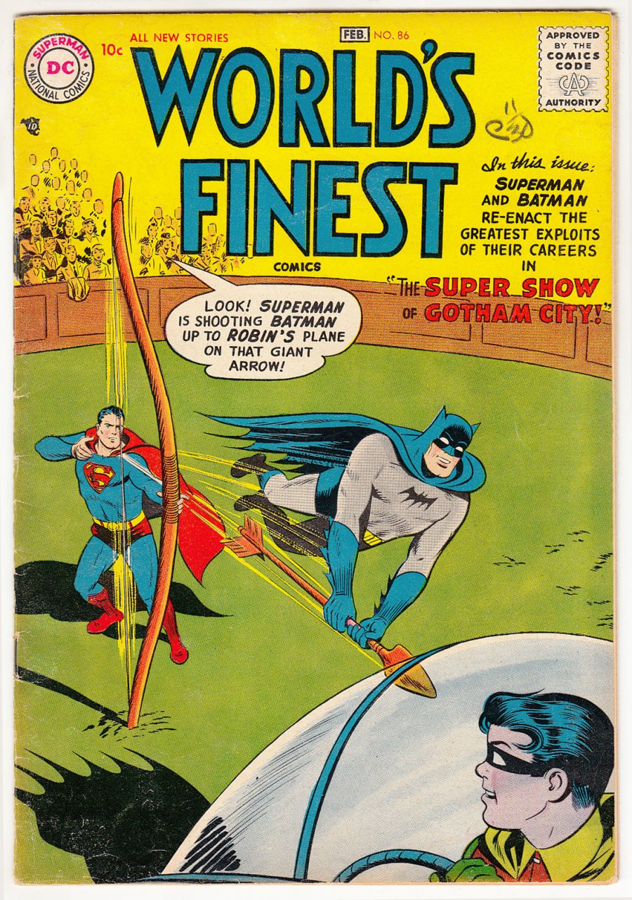 Green ArrowCover pencils by Curt Swan, inks by Stan Kaye. The Super-Show of Gotham City, script by Edmond Hamilton, pencils by Dick Sprang, inks by Stan Kaye; Superman, Batman and Robin are putting on a show for charity, but someone keeps sabotaging the performance. Jerry the Jitterbug humor page by Henry Boltinoff. The Cherokee Storm Raiders starring Tomahawk, script by Dave Wood, art by Bob Brown. The Day I Became A Lion Tamer text story. 1,000 Arrows to Doom starring Green Arrow, script by Dave Wood, art by George Papp; A millionaire offers to donate $100 to charity for each arrow Green Arrow shoots in a day.