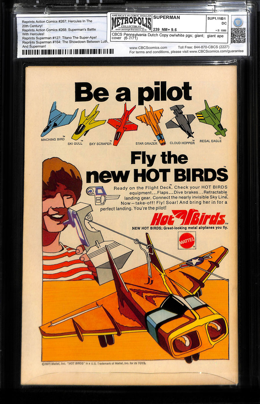 Pennsylvania Dutch CopyCover pencils by Curt Swan, inks by Murphy Anderson. DC Giant. Hercules in the 20th Century!, script by Otto Binder, pencils by Wayne Boring, inks by Stan Kaye; Lex Luthor builds a time-machine to bring Hercules to the present to use him to stop Superman. Superman's Battle with Hercules!, script by Otto Binder, pencils by Wayne Boring, inks by Stan Kaye; Hercules wants to marry Lois, but Lois won't marry him while Superman is around. Titano the Super-Ape!, script by Otto Binder, pencils by Wayne Boring, inks by Stan Kaye. The Showdown Between Luthor and Superman!,