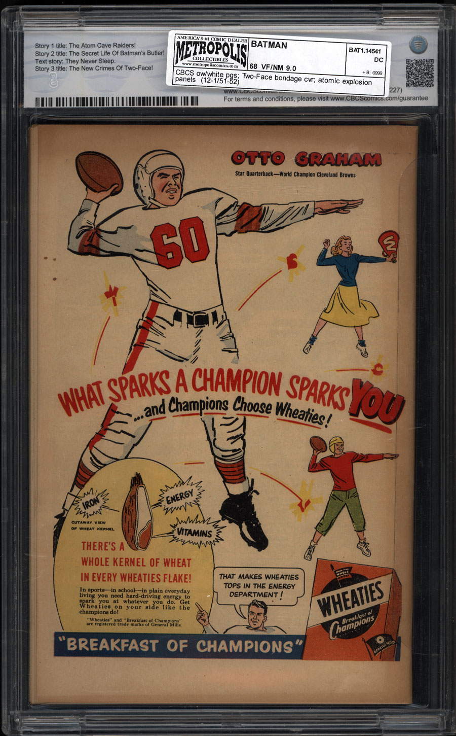 Win Mortimer Two-Face bondage cover; Dick Sprang/Bob Kane art; COMIC BOOK IMPACT rating of 7 (CBI)Cover by Win Mortimer. "The Atom Cave Raiders!" script by Bill Finger, pencils by Dick Sprang, inks by Charles Paris; A gang of criminals gets a professional geologist to help guide them to the caves in Gotham City; They decide to steal from the cave located underneath Wayne Manor; The Gotham City Police Department teams with Batman to intervene. "The Secret Life of Batman's Butler!" script by Bill Finger, pencils by Bob Kane (Batman and Robin figures only) and Lew Sayre Schwartz (as Bob Kane), inks by Charles Paris; Bruce fires Alfred without giving any explanation; The butler leaves, rents a cheap room in Gotham and reminisces about his past adventures with Batman and Robin. -page Jerry the Jitterbug story by Henry Boltinoff. Varsity Vic two-page story by Henry Boltinoff. They Never Sleep article, art by Raymond Perry. Full-page ad for House of Mystery # 1. One-page Tootsie Roll ad, "Pete the Flash Scores for Captain Tootsie" by Bill Schreiber. "The New Crimes of Two-Face!" script by Bill Finger, pencils by Bob Kane (Batman and Robin figures only) (signed) and Lew Sayre Schwartz (as Bob Kane), inks by Charles Paris; Paul Sloane is chosen to re-create the role of Harvey Dent and how he became Two-Face for a television program; Unfortunately, a klieg light explodes in Sloane's face, and the result is an appearance identical to that of the real Two-Face.