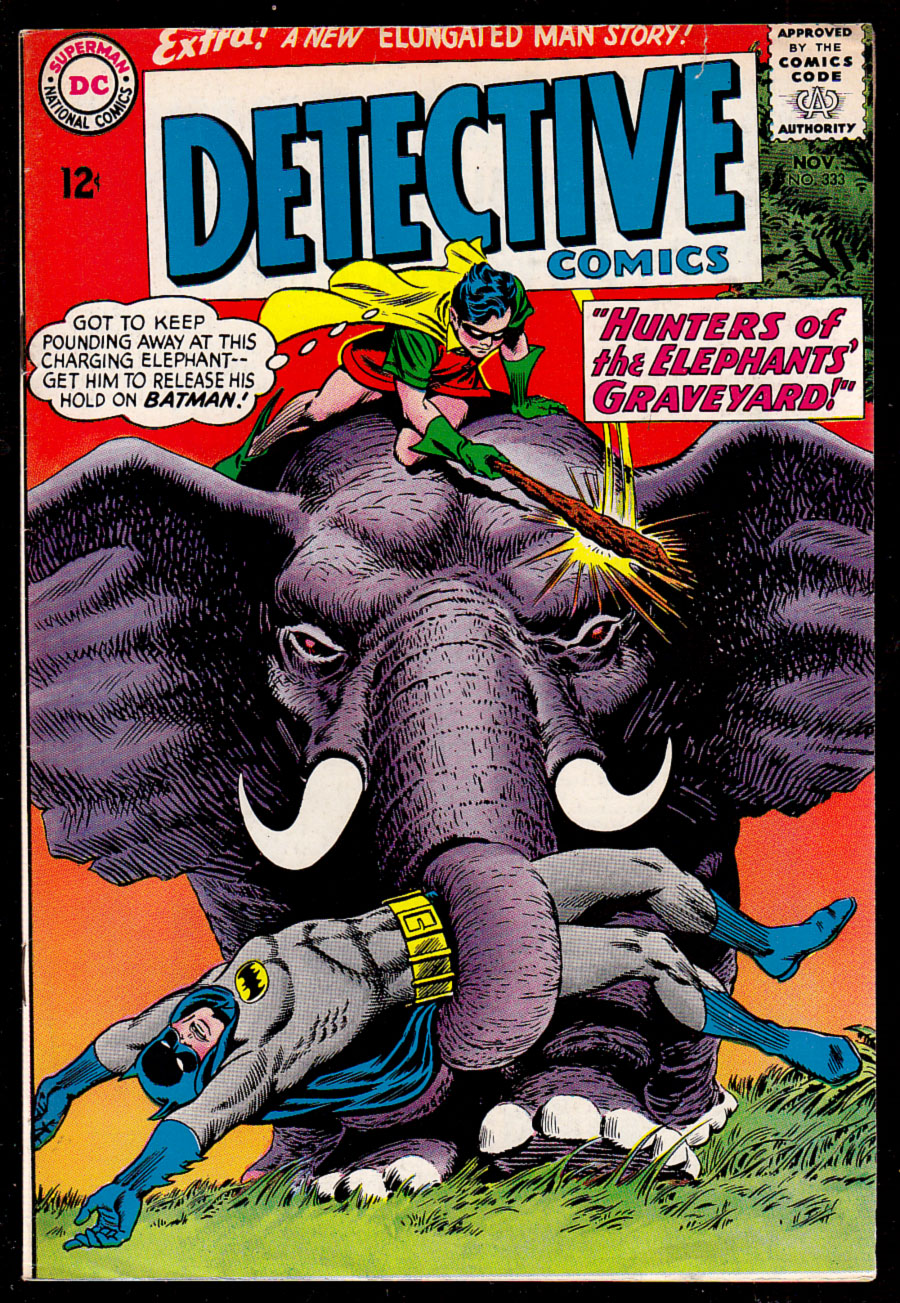 Robin vs. elephant battle cover; COMIC BOOK IMPACT rating of 5 (CBI)Written by Gardner Fox. Art by Carmine Infantino and Joe Giella. Cover by Carmine Infantino, Joe Giella, and Murphy Anderson. Hunters of the Elephants' Graveyard!; Batman and Robin travel to Africa to help Alice Foss, who poses as Glora "Goddess to all elephants" in order to help her husband, explorer Evan Bender. Written by Gardner Fox. Art by Carmine Infantino and Sid Greene. The Robbery That Never Happened! Starring Ralph Elongated Man Dibny and his wife, Sue Dibny. Casey the Cop humor page by Henry Boltinoff. Honesty is the Best Policy! public service announcement by Jack Schiff, art by Sheldon Moldoff.