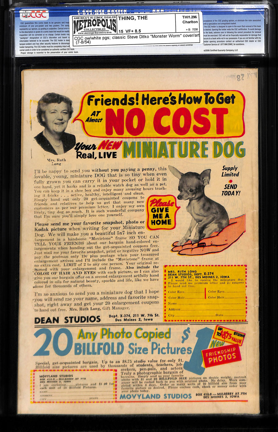 The Thing! in demand for his wild early work. This issue's cover features Ditko's mad mutant worm from the book's lead story of "The Worm Turns" plus four more stories featuring Ditko's pencils and inks!This gorgeous 8.5 copy (with only 5 books graded higher in the CGC Census) shows off Ditko's depth, with vivid colors and a striking focal point that illustrates his influence on several modern masters!