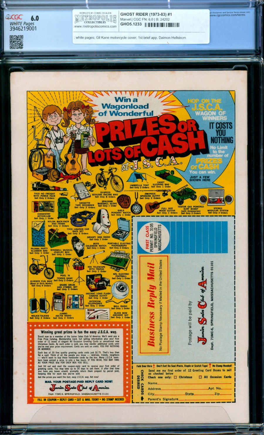 Ghost Rider's origins began in the Wild West, the original character was an eerie gunslinging horseback rider in his first iteration. Reimagined in the rough-and-tumble era of the 1970s as a motorcycle stuntman, no doubt influenced by the antics of Evel Knievel, Ghost Rider would become an instant cult success. The image of a rebel on a motorbike whose head is a flaming skull could simply not be denied, and the occult and supernatural trappings of his adventures appealed greatly to a public weaned on the grindhouse horrors of the era. This first issue of Ghost Rider capitalized on Johnny Blaze's success in the "try-out" anthology Marvel Spotlight which was spun off into this memorable and beloved series, spawning several reboots and motion pictures in the future.