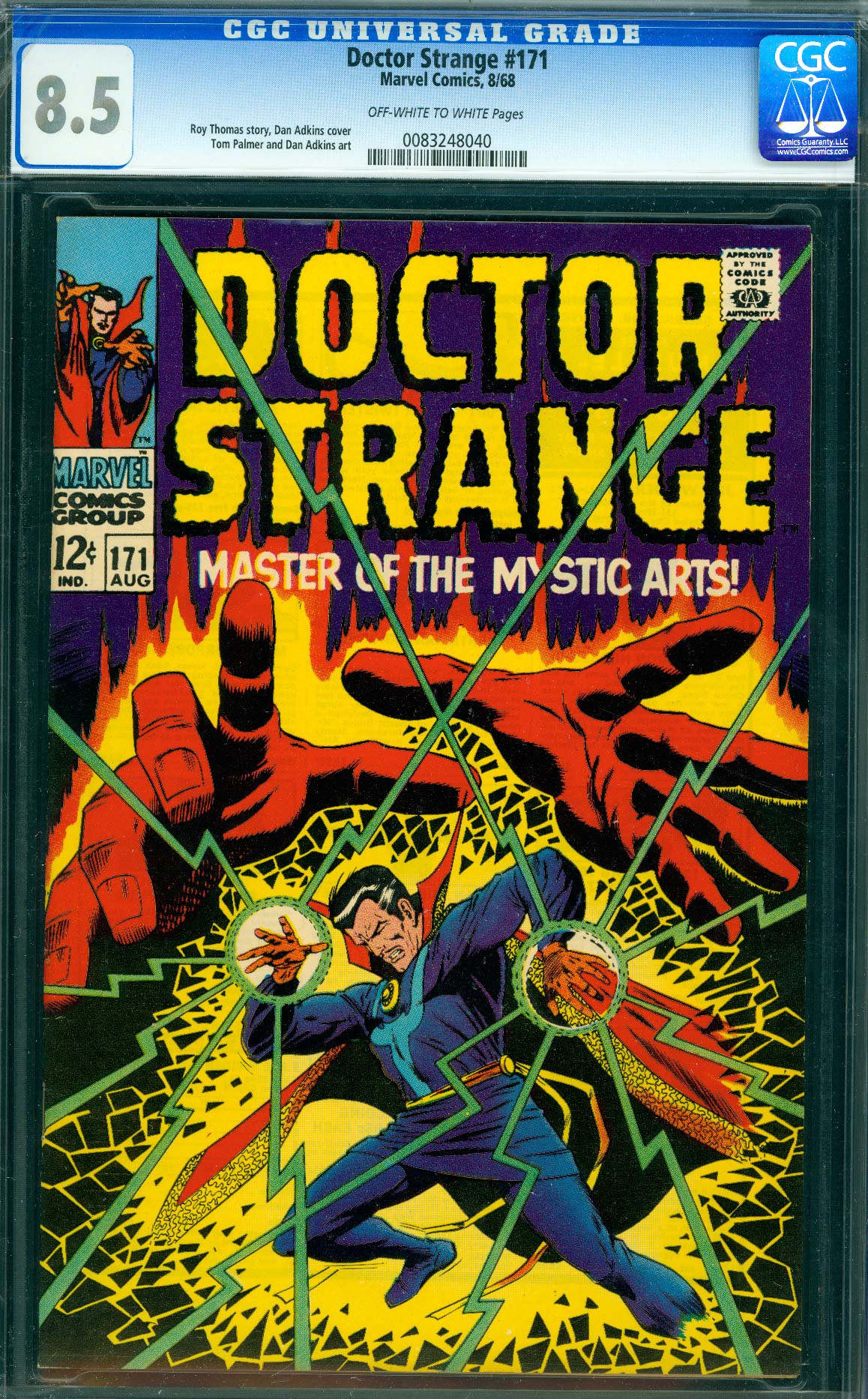 Cover art by Dan Adkins. In the Shadow of... Death!, script by Roy Thomas, pencils by Tom Palmer, inks by Dan Adkins; Strange, with Victoria Bentley as his mystic consort, seeks Clea in the Realm Unknown, only to confront Dormammu! Cover price $0.12.